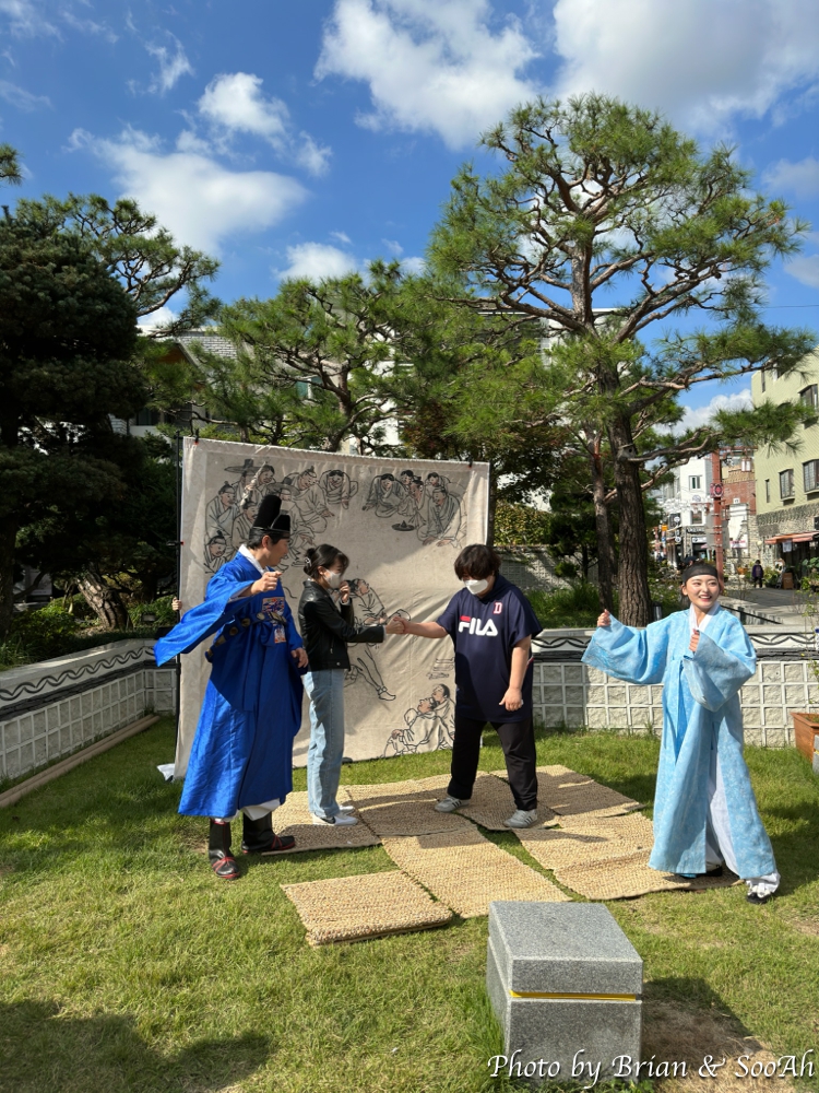 나름 가볍게 참가하고 두 화가에 대해서도 조금이나마 더 알게 되어 좋긴 했는데, 너무 자리를 오가기도 하고, 첫 회라 그런지 좀 어수선한 분위기가 있어서 그건 좀 아쉬웠습니다. 하지만 김홍도와 신윤복을 연기하신 두 배우님이 너무 열연을 하셔서, 행사 끝나고 두 분과 함께 사진을 찍었는데요.. 그 사진으로 이글을 마무리 합니다.