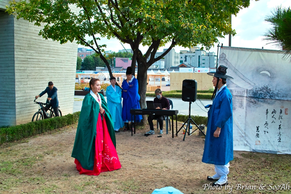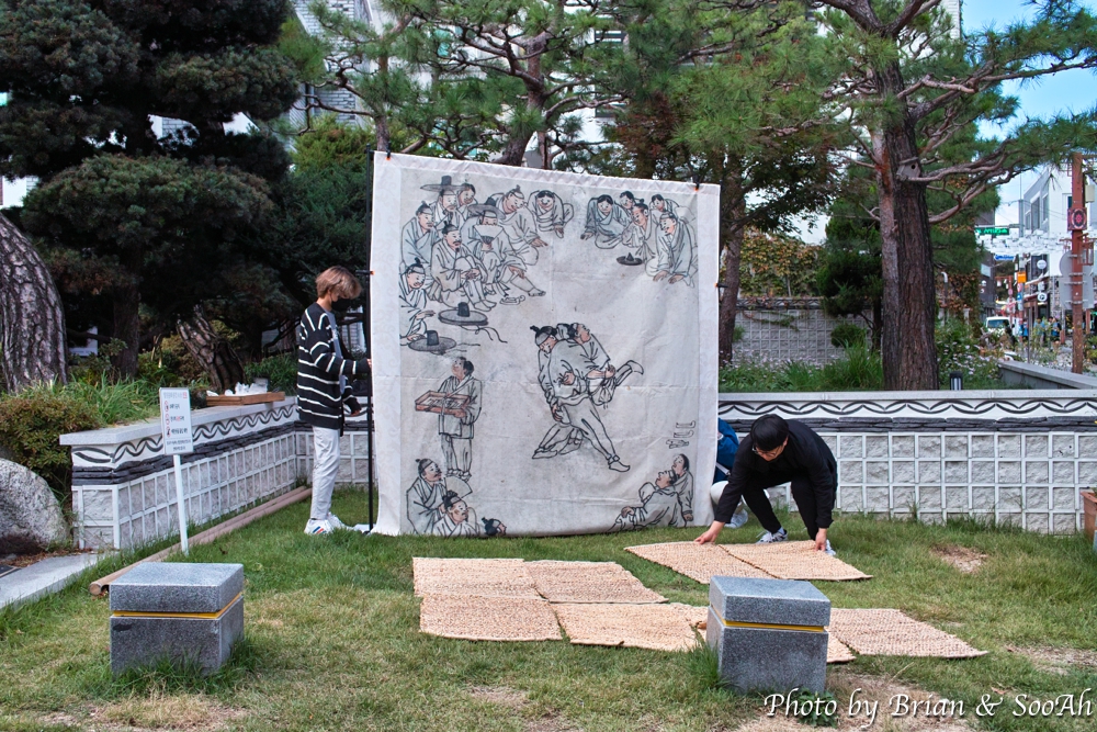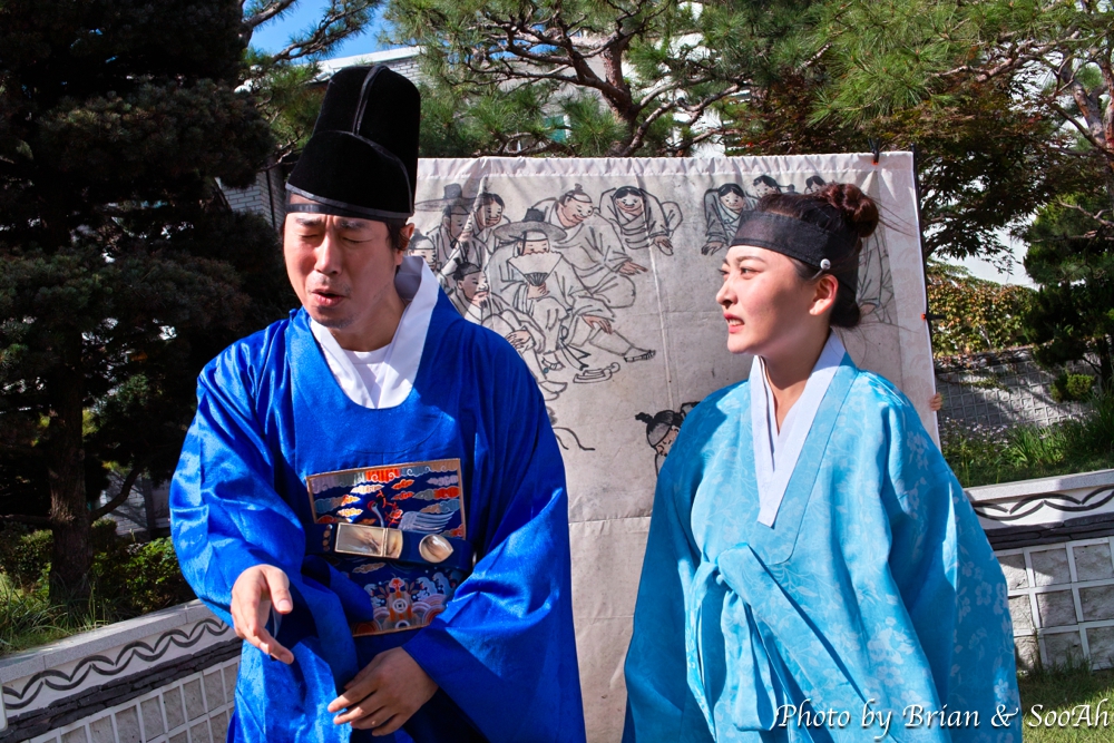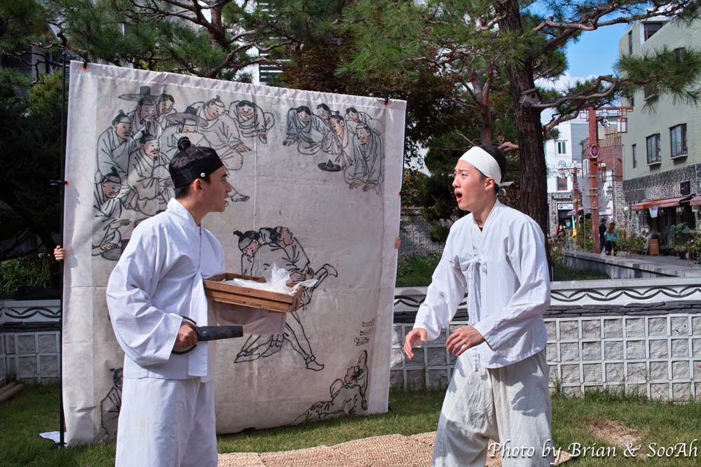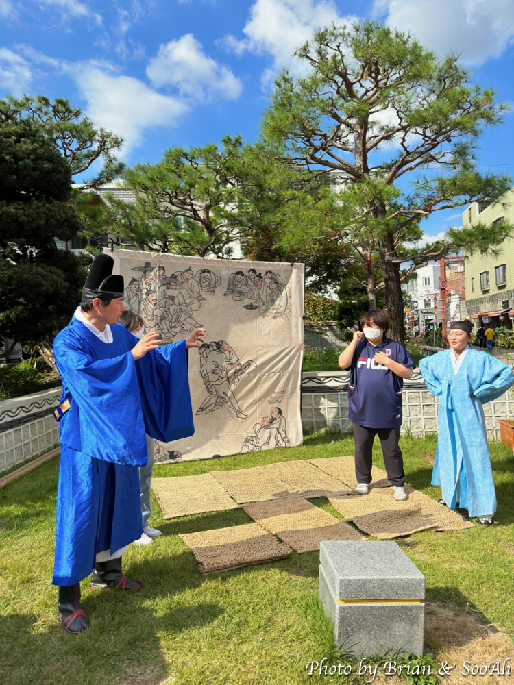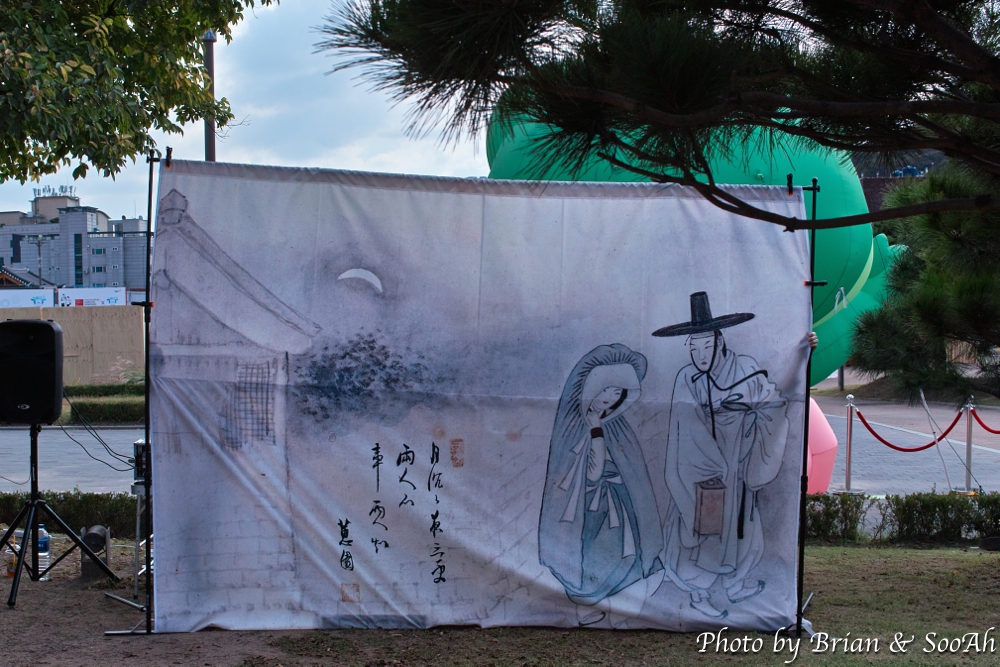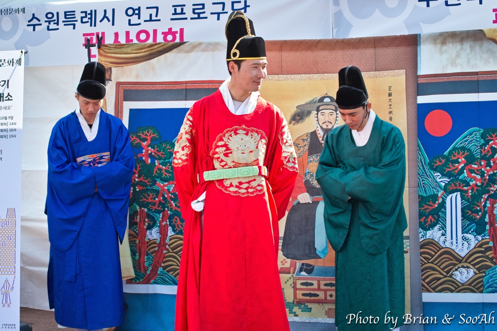 행사는 정조 시절에 조선의 르네상스를 대표했던 화가인 김홍도와 신윤복이 각각 자기의 작품이 더 낫다며, 관객들에게 각자 자기 작품에 관련된 이야기/상황극으로 어필하는 내용입니다. 김홍도의 "씨름", 신윤복의 "월하정인"과 여기가 화성이다 보니 김홍도가 있던 도화서에서 그렸던 정조대왕 어진까지 해서 이를 소재로 상황극, 관객 참여극이 진행되었는데요.