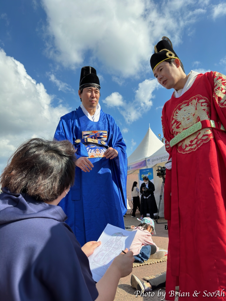 그렇게 노래 공연까지 보고는 마지막으로는 행궁광장으로 이동해서는 김홍도가 도화서에서 그렸던 반차도 얘기니 어진 얘기를 하다가, 정조대왕이 나와서는 갑자기 관객들에게 어진을 그리라며, 이미 윤곽선이 그려져 있는 정조대왕 어진이 프린트된 종이를 나눠 주고는, 다들 갑자기 색칠공부를.... (^^) 그 상황 속에서 일부 관객들이 그린 그림을 가지고 비평을 하며 놀리기도 하고 칭찬하기도 하고 하면서, 그 타임에서의 도화서 어진 담당 화가를 결정하는 결론까지 내리며 행사가 마무리 됩니다. 유튜브에는 보니 행궁 안에서 이 마지막을 진행해서 저희 타임 때에 행궁광장 바닥에 엎드려 한 것보다는 좀 나아 보이더군요.