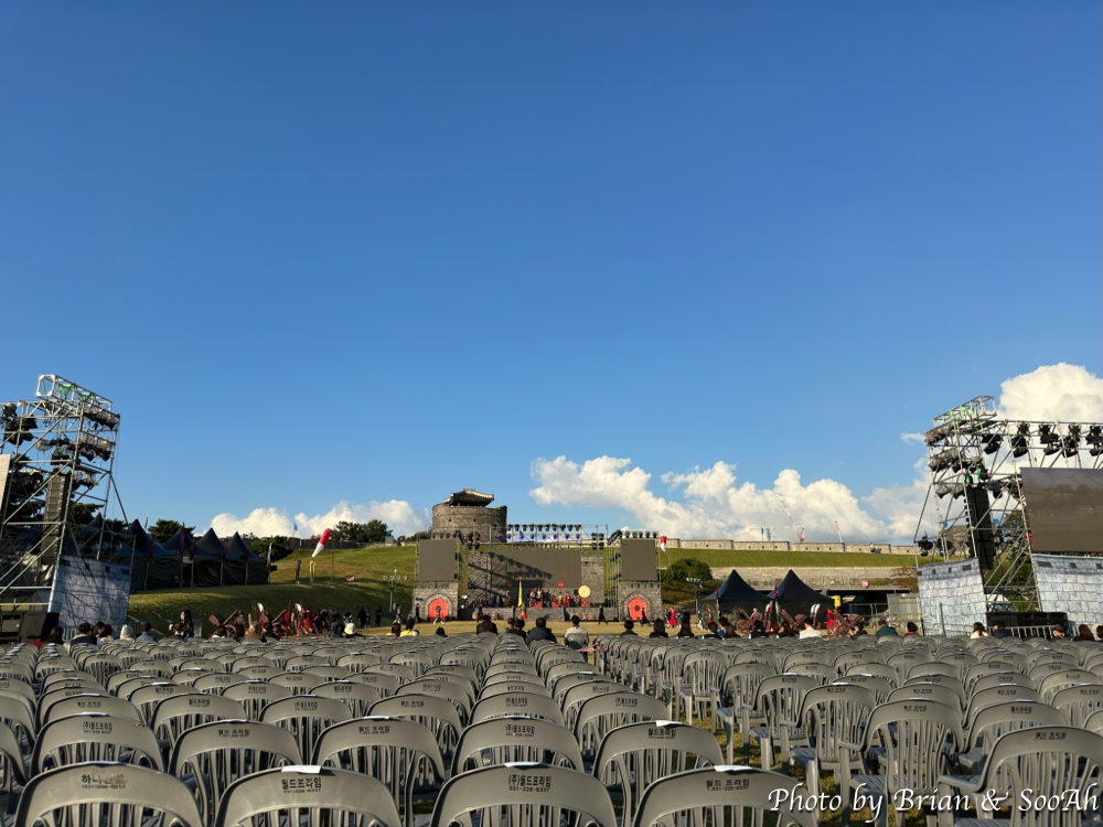 7일 금요일, 첫날이 되어도 교통통제 소식이 없어서 지난 번 하고 다르게 하나 보다 했는데, 실제로 무대도 창룡문 앞 들판에서 연무대 쪽 국궁체험하는 들판으로 옮겨지고, 자리도 도로 위가 아닌 연무대 들판으로 옮겨지면서, 무대도 작아지고, 볼 공간도 작아지고, 들판에 평화로이 앉아 볼 수도 없게 되어서 조금 실망을 했습니다. 그리고 무대가 들판에서 경사가 진 위쪽이어서, 만들어진 간이 좌석에서 보면 약간 올려다 봐야하는데, 좌석간 단차는 없고, 중앙 앞쪽...이라고는 하지만, 만들어진 간이 좌석의 거의 40%를 차지하는, 이른바 "관계자, 귀빈용 좌석" 때문에 그 뒤에 앉아서 보면 정말 멀리 작게 보이는 것을 떠나서 앞 사람 머리에 가려서 보이지도 않는 상황이라, 현장에서 공연 그 자체를 보는 게 아니라 양쪽에 설치된 대형 스크린을 봐야 하는.... 너무 답답한 상황이 발생하더군요.