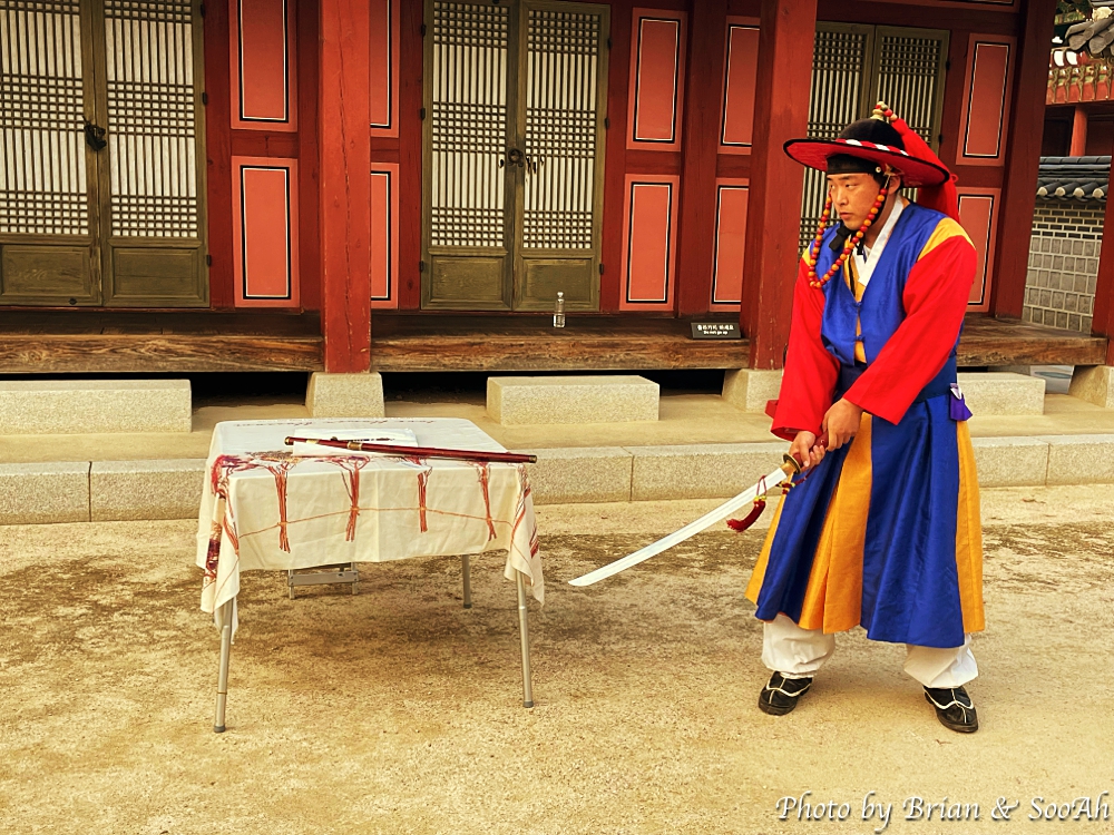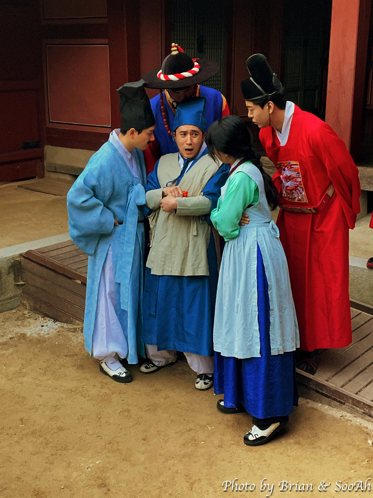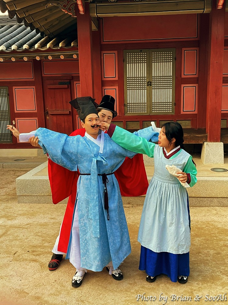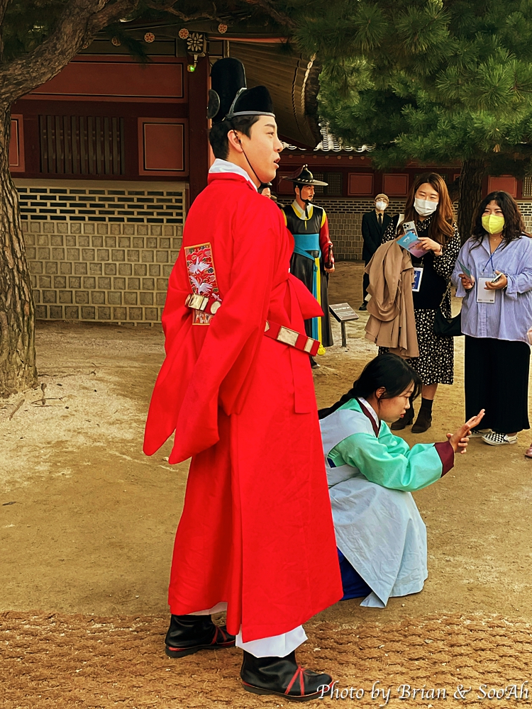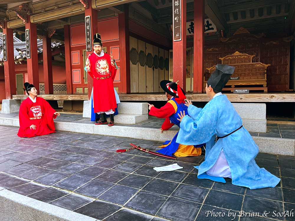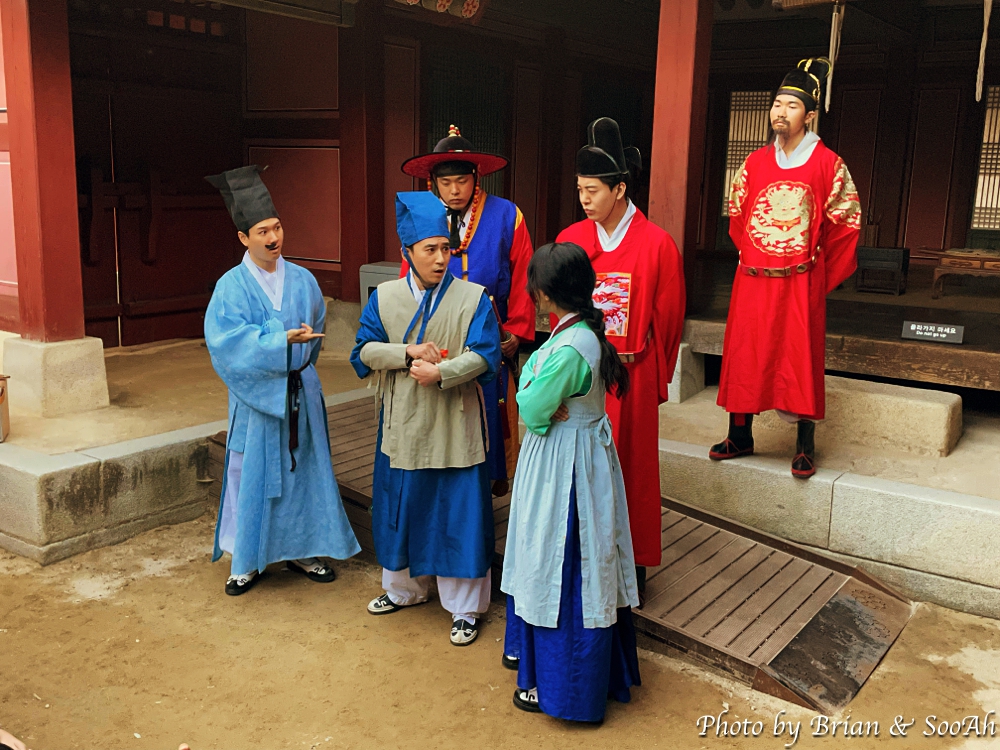 행사 시작 시간이 되니, 수라간 나인 복장을 한 배우가 나와서는 '내일 진찬연이 열려 수라간이 바쁘다'는 이야기를 하는 중에, 사모관대를 차려 입은 한 배우(정약용이라고 하네요 ㅎㅎㅎ)가 나와서는 이야기를 이어가다, 나인이 잠깐 안으로 들어갔다가는 다시 뛰쳐나오면서, 진찬연에 올릴 약과가 사라졌다면서, 범인이 남기고 간 물건들을 들고 나와서는, 다 같이 범인을 잡으러 가자면서, 다음 장소로 안내를 했습니다. 이후로는 장소를 이동해 가면서, 현장에 남겨졌던 물건들의 주인(?)에 해당하는 이들이 한 명씩 용의선상에 올라가게 되면서 각자 무죄를 주장하는 상황극을 관람객들과 함께 진행하는 그런 행사였습니다. 그 용의선상에는 정조까지 올라서게 되는데요 (ㅎㅎ)
