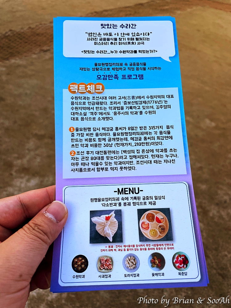 행사가 진행되는 동안, 사전예약한 분들 말고도 다른 일반 관람객들도 함께 다니며 관람을 해서 조금 불편하기도 했는데, 마지막 복내당에서 진행할 때는 사전예약자인지를 확인-처음 나눠줬던 출입증 목걸이-해서는 입장시키던구요. 이 마지막 장소에는 약과를 훔쳐간 범인이 밝혀지는데요, 이 마지막 부분에 나름 감동도 있고, 또 군무를 하며 신나게 하는 부분도 있어서 참신했었습니다. 그리고 이 사라진 약과를 예약한 관람자 모두에게 나눠줬습니다. 경복궁에서 하는 생과방에서처럼 찬합에 담아서 이쁘게 보자기로 포장하고 꽃으로 장식해서는 나눠 줬는데요. 수원약과를 포함해서 이쁘게 생긴 다과들이 담겨 있어서 보기 참 좋더군요. 아, 맛도 있었습니다.