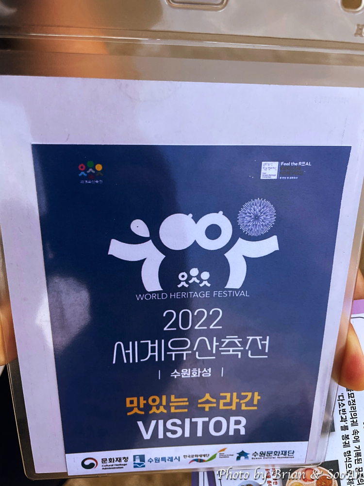 이번 22년 수원화성문화제/세계유산축전에서 사전예약하는 행사가 몇 개 있었는데, 화성행궁이나 성곽을 투어하는 것들은 몇 번 참여하기도 하고, 저 혼자도 매일 걷는지라.. 새로 생긴 행사만 이번에 예약을 했는데, 그 마지막 참여행사로 간 게 '맛있는 수라간'이라는 행사였습니다. 화성행궁광장의 한 쪽에 있는 행사 안내 부스에서 예약 내역을 확인했더니, 이 행사가 화성행궁 안에서 진행하다 보니 출입증에 해당하는 목걸이와 행사 안내 부클렛을 나눠주고는 행사가 시작되는 행궁 안(신풍루 너머)의 비장청 출입문 앞으로 이동했습니다.