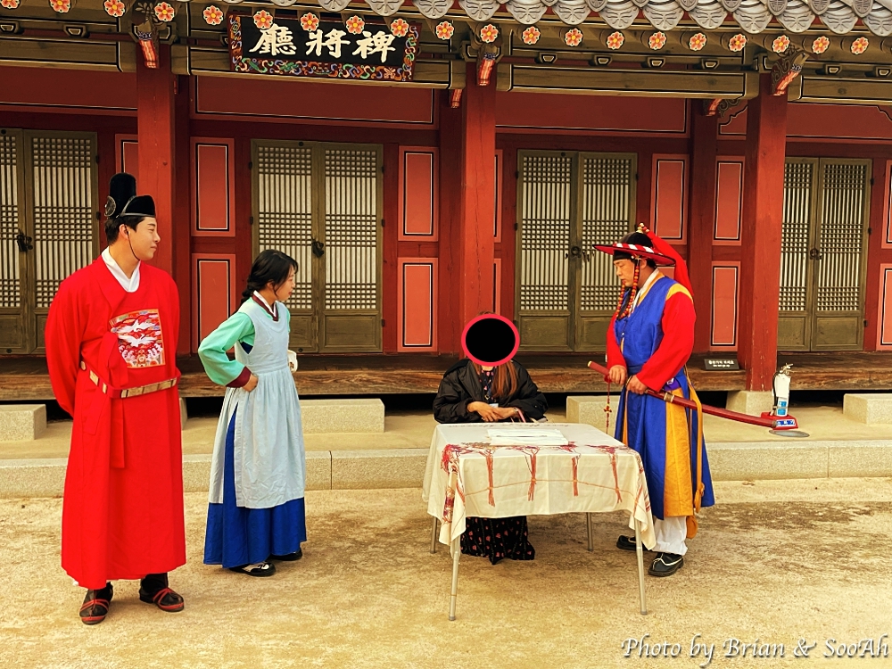 행사 시작 시간이 되니, 수라간 나인 복장을 한 배우가 나와서는 '내일 진찬연이 열려 수라간이 바쁘다'는 이야기를 하는 중에, 사모관대를 차려 입은 한 배우(정약용이라고 하네요 ㅎㅎㅎ)가 나와서는 이야기를 이어가다, 나인이 잠깐 안으로 들어갔다가는 다시 뛰쳐나오면서, 진찬연에 올릴 약과가 사라졌다면서, 범인이 남기고 간 물건들을 들고 나와서는, 다 같이 범인을 잡으러 가자면서, 다음 장소로 안내를 했습니다. 이후로는 장소를 이동해 가면서, 현장에 남겨졌던 물건들의 주인(?)에 해당하는 이들이 한 명씩 용의선상에 올라가게 되면서 각자 무죄를 주장하는 상황극을 관람객들과 함께 진행하는 그런 행사였습니다. 그 용의선상에는 정조까지 올라서게 되는데요 (ㅎㅎ)