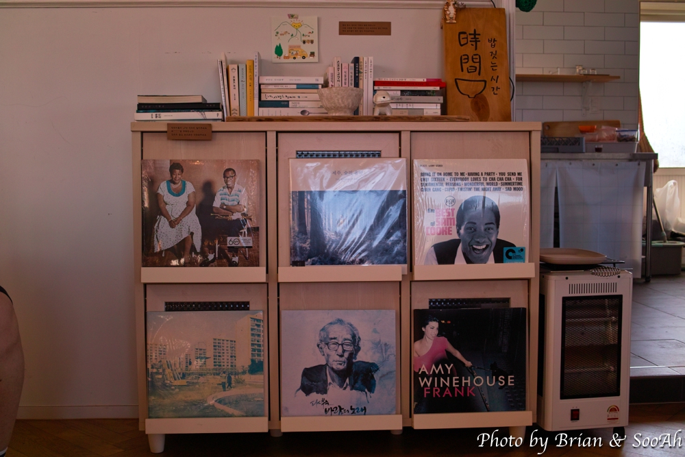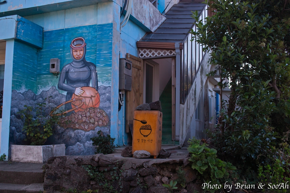 해녀들이 모이는 장소인 해녀촌 건물 2층에 있는 밥집인데요. 가게 밖은 해녀촌 건물임이 잘 표현된 벽화들이 있구요. 그 옆 가게 표지판(?) 뒤의 계단을 따라서 올라가면 아늑한 내부의 식당이 나옵니다. 오후 5시 아직은 따사로운 햇빛이 드는 식당 내부도 맘에 들었지만, 가게에서 내다 본 밖의 풍경이 저 멀리 평대 바다까지 펼쳐진 광경이 맘을 편하게 만들더군요.