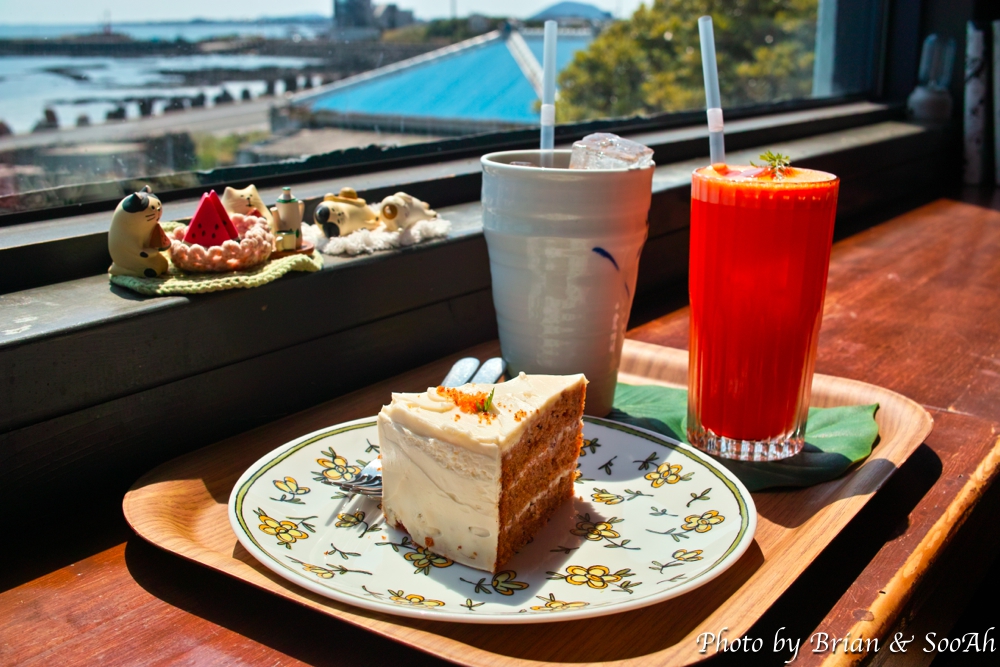 숙소에서 체크아웃하고 나와서는 오전의 여유로움을 즐기기 위해 냥이카페는 아니지만 냥이 굿즈가 많은 요요무문이란 카페를 들렀습니다. 평대해변이 보이는 해녀회관 건물 2층을 개조해서 만든 카페인데, 카페가 파스텔톤에 햇살이 가득하니 너무 이쁘더군요. 체크아웃 때문에 정신없었던 아침을 이 카페에서 바다를 바라보면서 잠시 힐링하며 풍경을 즐겼네요.