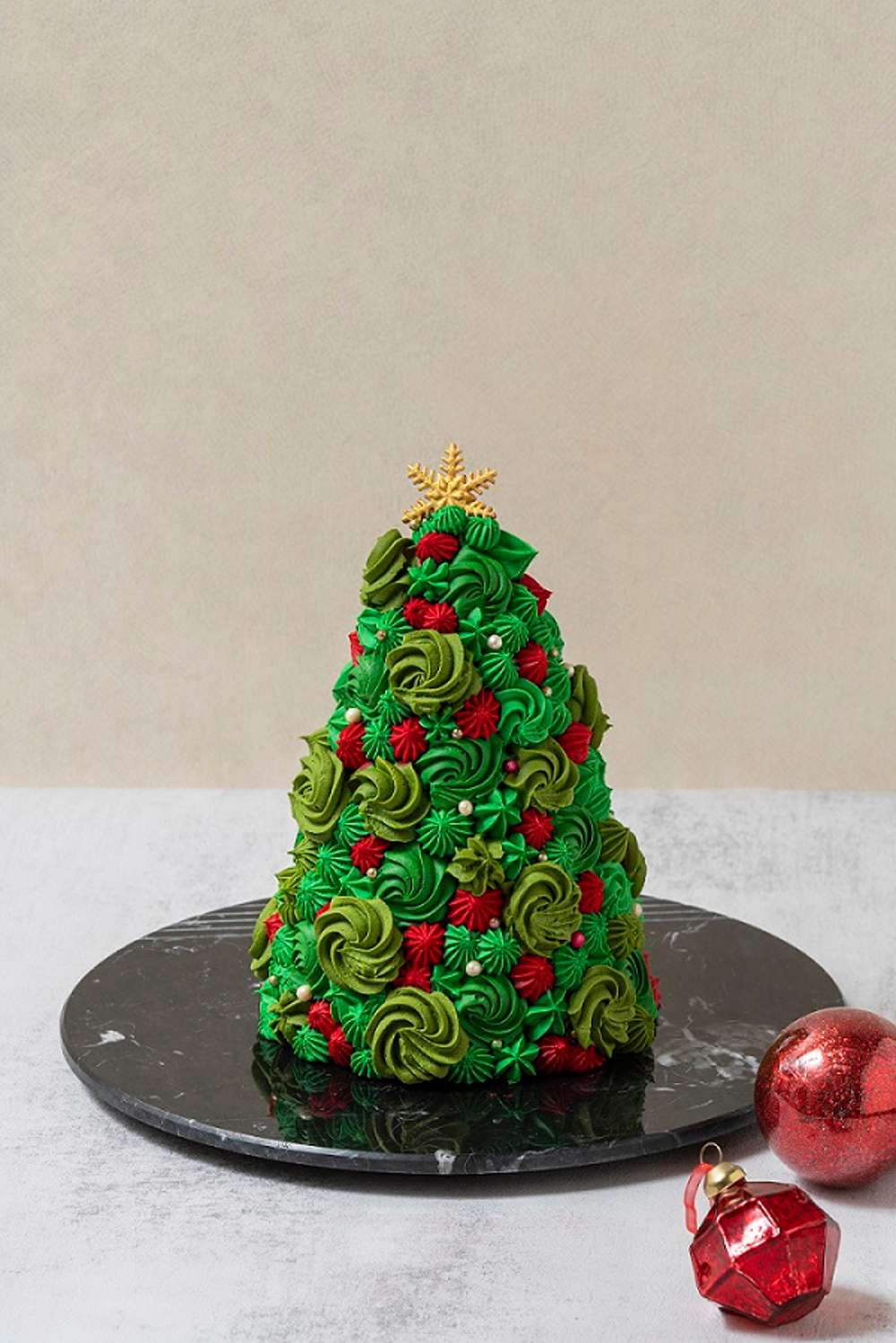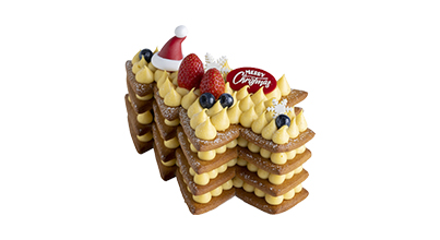 | 고소한 진저 쿠키에 달콤한 커스터드 크림과 블루베리, 딸기 등을 곁들인 트리 모양의 타르트 케이크 입니다. | 마스카포네 크림이 샌드된 부드러운 스펀지 시트에 2단으로 딸기를 가득 올린 딸기 생크림 케이크 | 다크 초코 무스와 체리가 샌드된 통나무 모양의 초콜릿 시트에 초콜릿, 마카롱을 더한 진한 초콜릿 케이크 입니다. | 촉촉한 레드벨벳 시트에 리스 모양으로 장식된 마카롱과 진한 치즈의 풍미가 어우러진 케이크 |