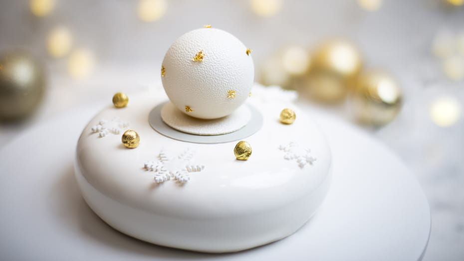 눈꽃 모양과 금 장식과 함께 화이트 초콜렛을 글레이즈드된 페스티브 케이크 오미자&초콜릿 무스, 라즈베리 잼, 코코아 스폰지, 헤이즐넛 잔두야 가나슈, 코코아 헤이즐넛 잔두야 크리스피 비스킷 알레르기 식품 안내 : 계란, 견과류, 글루텐, 젤라틴, 유제품, 대두, 알코올 |