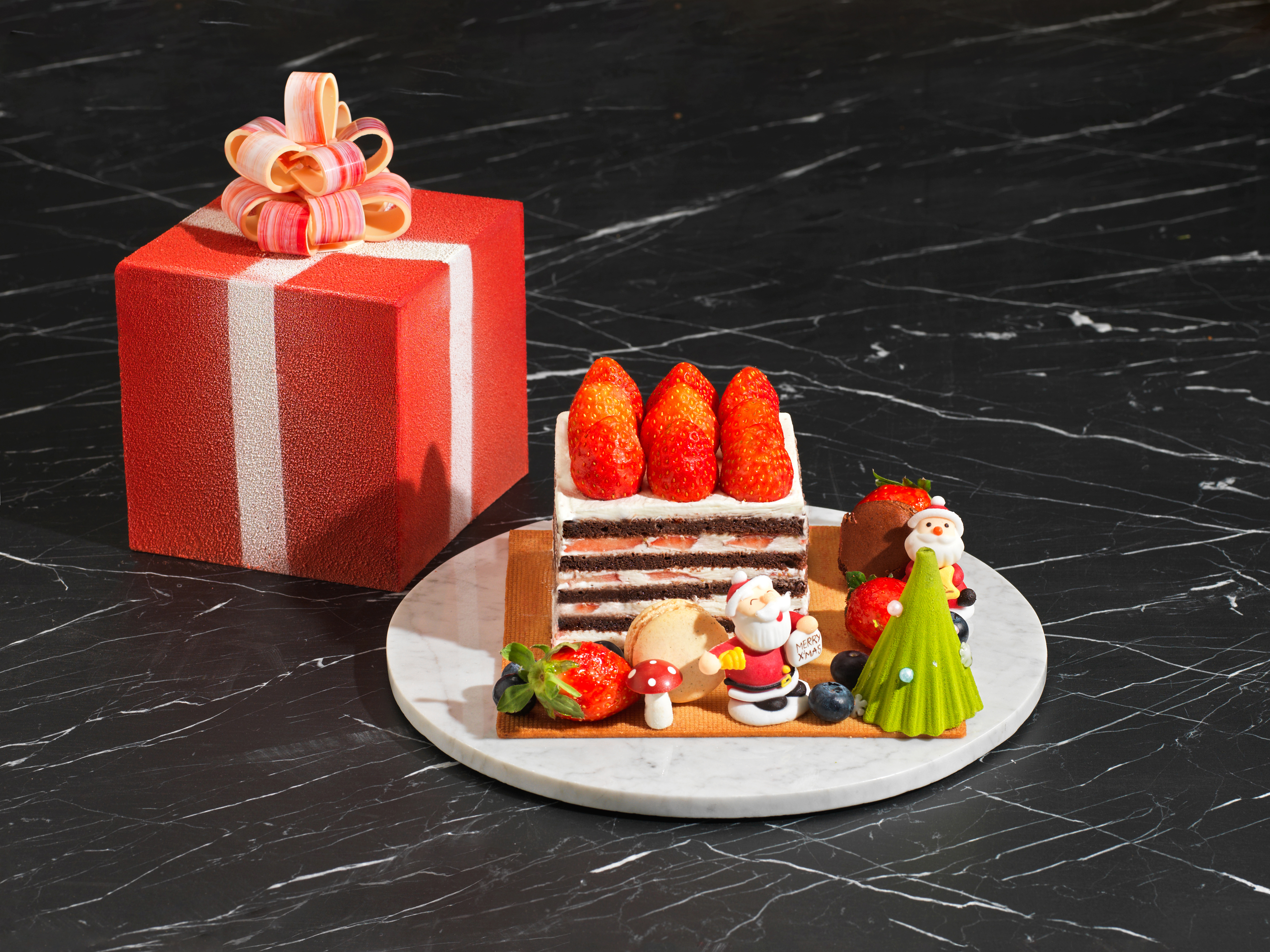 | 설레는 크리스마스를 만들어 줄 선물을 생각하며 만든 케이크로, 약 8시간 이상 소요되는 딸기 초콜릿 선물 상자 안에 생딸기와 마스카르포네 크림으로 샌드 된 초콜릿 스펀지케이크가 들어 있습니다. 선물상자 주변에는 트리 모양의 무스 케이크와 산타 머랭, 딸기, 마카롱 등으로 장식했습니다. *알레르기 정보 : 인스피레이션 딸기 초콜릿(프랑스산), 딸기(국내산), 계란(국내산) |