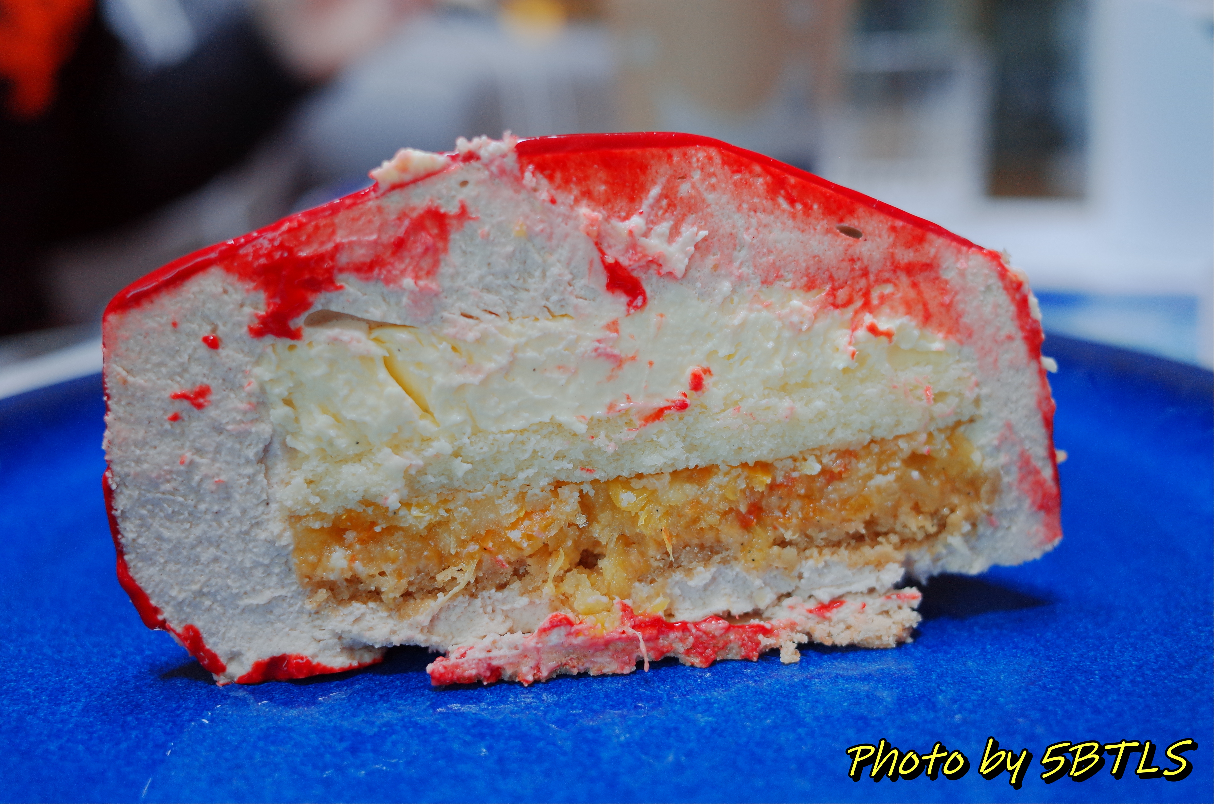 솔직히 케이크의 바깥인 저 빨간색은 도대체 뭔지 잘 모르겠더군요. 라즈베리크림인지 딸기크림인지, 아님 식용착색...은 아닌 거 같고.... 케이크의 내부는 기본적으로 전체는 정향의 섞인 진저브레드 무스구요, 가장 아래에는 조꽁드 비스킷(Joconde Biscuit)를 받침으로 쓰고, 무스 안에 아래쪽부터 오렌지 마말레이드 콤포트, 위에는 바닐라 크림 브륄레가 있고 그 사이에 진저브래드 스폰지가 있는 구조입니다.