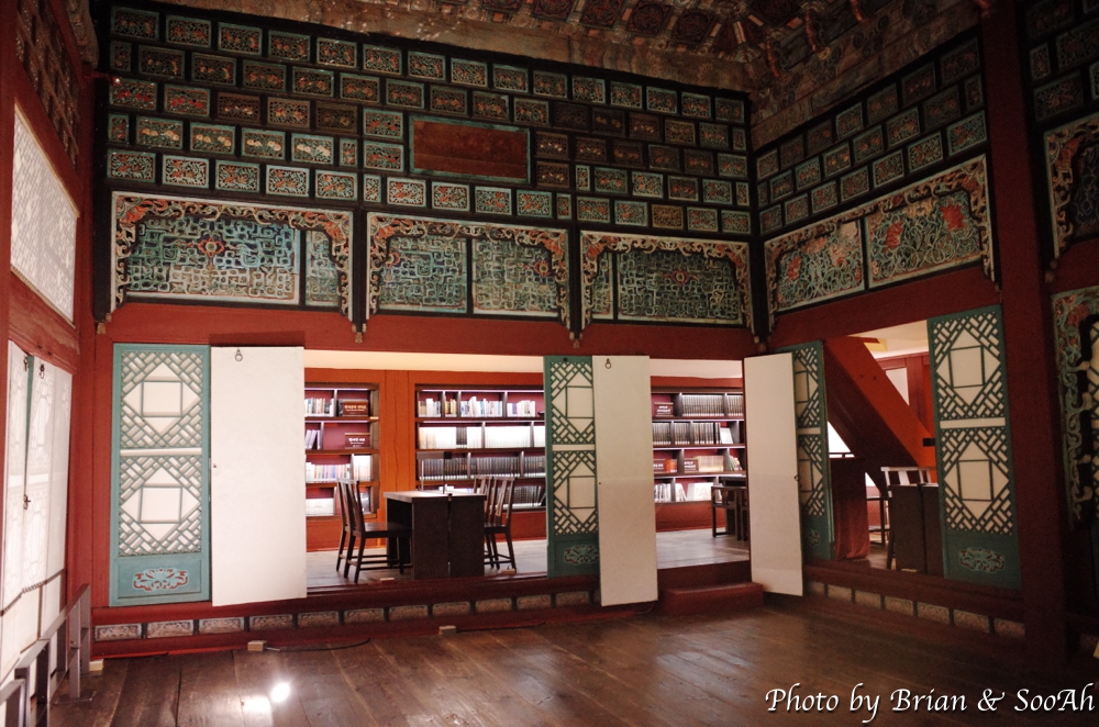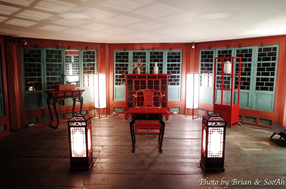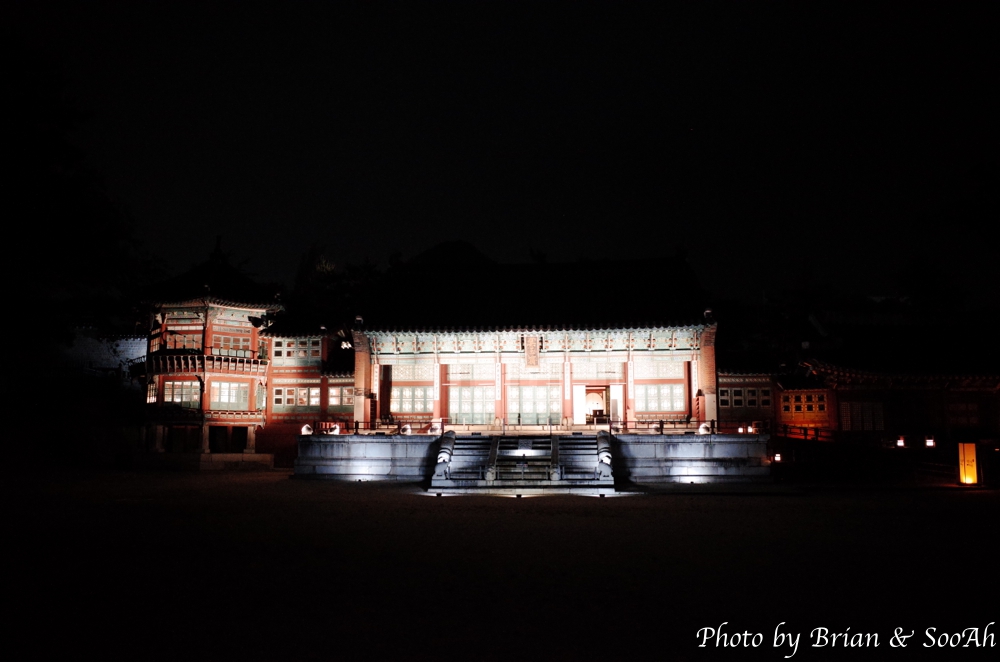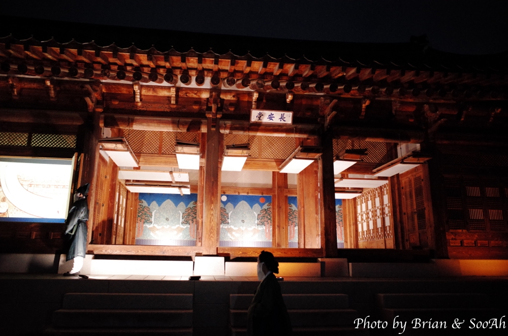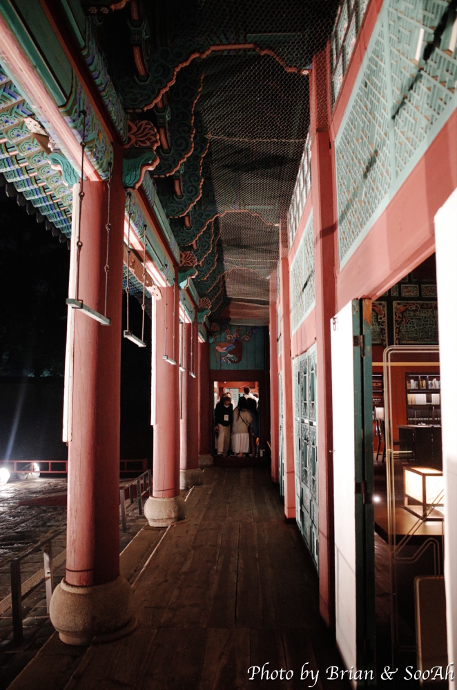 예상 외의 뜻깊고 즐거웠던 '장고'의 방문을 하고 나니 비가 보슬보슬 내리기 시작하더군요. 발걸음을 빨리해서 경복궁 가장 북쪽에, 약간 중국 풍의 건물인 집옥재와 팔우정으로 이동했습니다. 늘 지나가면서 바깥만 봤는데, 이 날은 두 문화재의 내부를 구경할 수 있었습니다. 물론 궁중문화축전에 이 곳에서 독서를 하는 행사가 있기도 했지만, 밤에 이 곳을 들어와서 보는 게... 이 건물 안에 전등이 켜져 있는 게, 왠지 개화기에 어케든 서구문명을 받아들이려 궁궐에도 뭔가 설치하고 하던 그 때가 생각나서 뭔가 짠하기도 하고, 울림이 좀 있더군요. 참석자가 너무 많아서 제대로 내부를 보지 못하고, 거기에 비까지 와서 내부를 오래 보기가 좀 그런 상황이라서... 그래도 어쨌던 집우재의 내부와 팔우정의 내부 그리고 2층을 살짝 쳐다보는 걸 줄지어서 구경을 하고는 다음 장소로 이동했습니다.