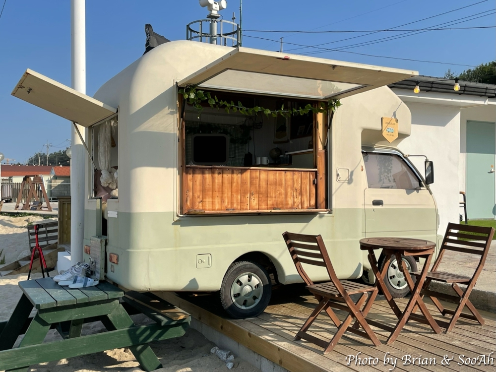 주문진까지 올라가서 늦은 점심을 먹고는 넷째날의 마지막 일정이자 여행 전에 미리 예약을 해 뒀던 장소로 이동했습니다. 사근진 해변 근처의 모래사장에 세워둔 소형캠핑카를 2시간 정도 대여해서 바다도 즐기고 커피도 마시고 인생샷도 남기고 하는 곳인데, '라라 피크니카'라고 포탈 사이트에서 찾으시면 확인이 가능한데요. 여행 전에 이 곳 저 곳 재밌는 경험을 할 곳을 찾다가 발견한 곳으로 네째날 마지막 시간(하루에 2~3회 예약을 받음)으로 예약을 했습니다. 보니까 해안가 펜션 중 한 곳에서 같이 운영하시는 곳이었는데, 이전 시간의 커플이 아직 마무리가 되지 않아서(조금 일찍 도착했습니다) 기다리다가 시간이 되어서는 사용을 시작했습니다.