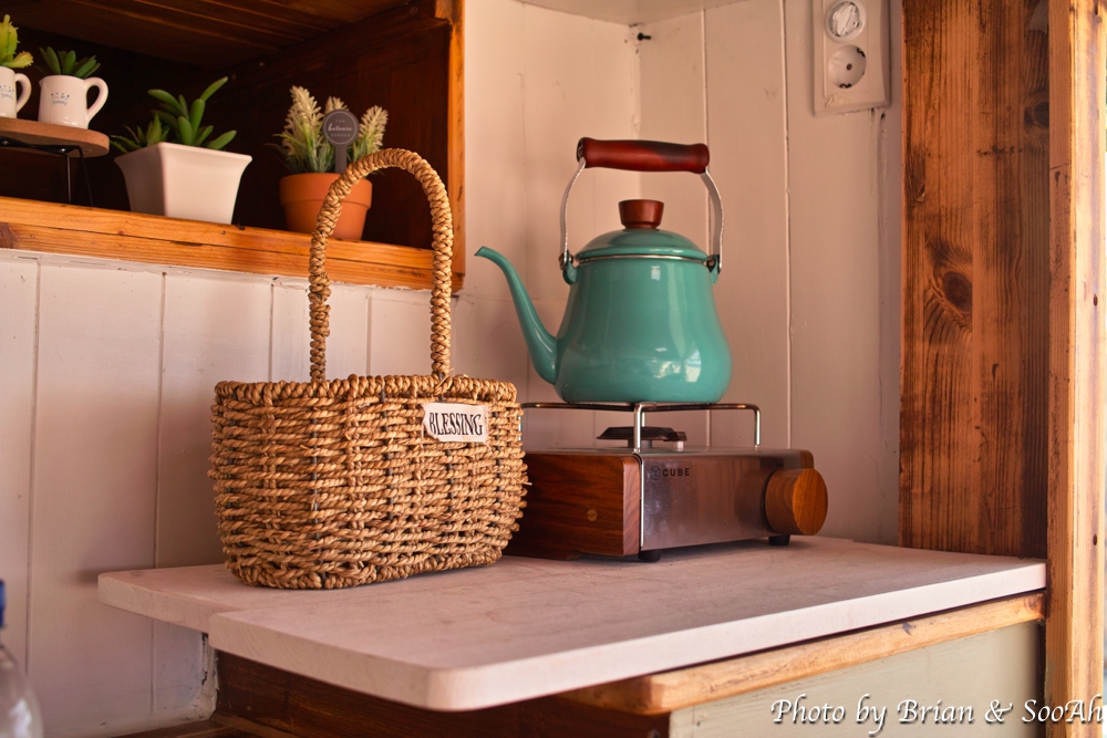 그리고 티백으로 된 차와 커피 등이 있어서 커피포트를 이용해서 마실 수도 있었습니다만.... 캠핑카 앞의 우드 탁자와 의자, 그리고 백사장과 넘실대는 파도 앞에서 사진 찍느라 바빠서 뭐 마시고 먹고 하는 건 거의 하지도 않은 거 같네요.