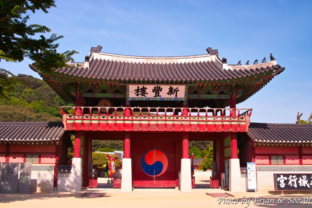 행궁광장에서 바라보니 청의와 홍의를 입은 대형 수문장 피규어가 있었고, 홍살문을 지나서 화성행궁의 정문 역할을 하는 신풍루(新豊樓)를 지나서 행궁 안으로 입장을 했습니다. 신풍루는 누각이면서 또 행궁의 삼문(三門) 중 외삼문(外三門)에 해당됩니다. 원래는 '진남루'라고 이름 지어졌지만, 중국을 통일했던 한고조의 고향이 '풍패'라는 곳인데, 이 때문에 제왕의 고향을 '풍패'라고 부르는 표현이 쓰였다고 해야 할까요. 그래서 조선을 건국한 태조 이성계의 본관(5대조의 고향이기도 한)이 전주이다 보니 전주에 '풍패지관'이라고 하는 객사도 있고, 또 전주의 풍남문에서도 풍패=전주의 남쪽이라는 뜻에서 지어진 이름입니다. 정조께서 아버지 사도세자가 모셔진 수원화성을 자신의 고향과도 같은 곳이라는 의미에서 '새로운 풍패'라는 뜻으로 신풍이라는 이름을 붙이게 되었다고 하니, 얼마나 정조가 이 화성행궁을 애지중지 했는지 알 수 있지 않나 싶네요.