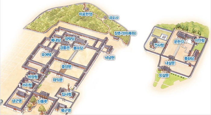 조선은 기본적으로 성리학을 숭상한 유교국가이다 보니, 궁궐의 경우에도 성리학적인 사상이 반영된 건축 구조를 가지게 되는데, 그 중 하나가 백성/신하가 임금이 계신 곳까지 가기 위해서는 반드시 3개의 문을 지나야 합니다. 경복궁의 경우에도 광화문-흥례문-근정문을 지나야 하고, 창덕궁도 돈화문-진선문-인정문 or 숙장문을 지나야 임금이 계신 곳에 도달하게 되죠. 화성행궁도 엄연히 임금이 거처하시는 곳이므로 이 삼문의 구조를 가지고 있는데, 가장 바깥인 외삼문이 신풍루이고, 그 다음이 중삼문(中三門)에 해당되는 좌익문(左翊門)이 위치합니다. 좌익문을 지나면 마당을 하나 지나서 마지막인 내삼문(內三門)인 중양문(中陽門)에 도달하게 됩니다. 이 중양문을 지나면 혜경궁 홍씨와 정조가 머물던 봉수당, 즉 임금님의 권역에 도달하게 됩니다.