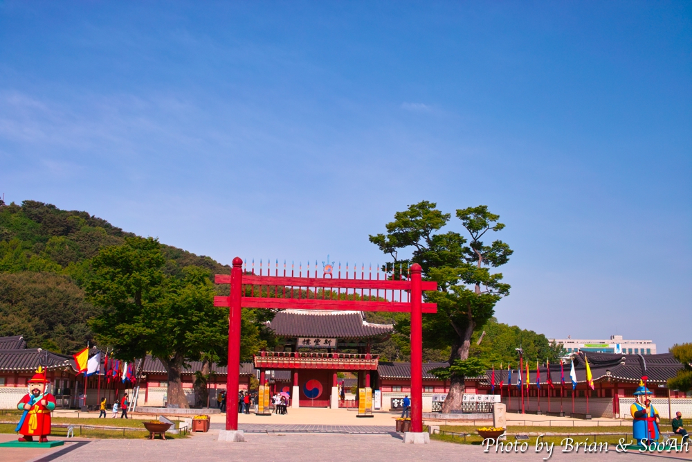 행궁광장에서 바라보니 청의와 홍의를 입은 대형 수문장 피규어가 있었고, 홍살문을 지나서 화성행궁의 정문 역할을 하는 신풍루(新豊樓)를 지나서 행궁 안으로 입장을 했습니다. 신풍루는 누각이면서 또 행궁의 삼문(三門) 중 외삼문(外三門)에 해당됩니다. 원래는 '진남루'라고 이름 지어졌지만, 중국을 통일했던 한고조의 고향이 '풍패'라는 곳인데, 이 때문에 제왕의 고향을 '풍패'라고 부르는 표현이 쓰였다고 해야 할까요. 그래서 조선을 건국한 태조 이성계의 본관(5대조의 고향이기도 한)이 전주이다 보니 전주에 '풍패지관'이라고 하는 객사도 있고, 또 전주의 풍남문에서도 풍패=전주의 남쪽이라는 뜻에서 지어진 이름입니다. 정조께서 아버지 사도세자가 모셔진 수원화성을 자신의 고향과도 같은 곳이라는 의미에서 '새로운 풍패'라는 뜻으로 신풍이라는 이름을 붙이게 되었다고 하니, 얼마나 정조가 이 화성행궁을 애지중지 했는지 알 수 있지 않나 싶네요.