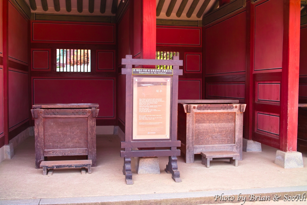 이 유여택 앞에는 해시계인 앙부일구가 있고, 또 화성행궁이 정조의 아버지 사도세자의 능을 찾아가기 위해 들리는 행궁이라 그런지 사도세자의 비극적 죽음과 연관된 뒤주들이 또 전시되어 있습니다. 옛날에는 이 뒤주에 들어갈 수 있었던 거 같은데, 요즘은 열려 있긴 한데 들어가 보시는 분을 못 봐서 잘 모르겠네요.