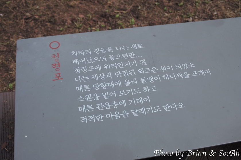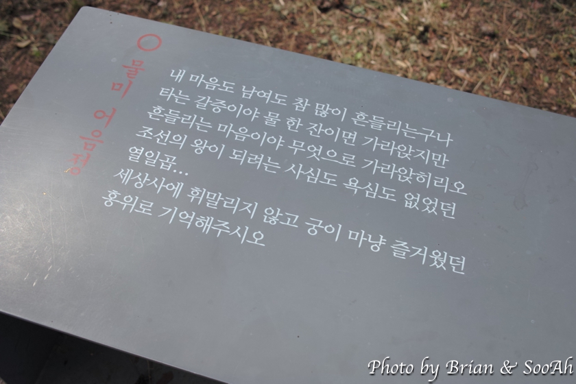 청령포 내에 숲 안으로 들어가면, 이 곳에 아무도 못 들어오게 한다는 "금표"도 있고, 단종이 유배생활을 지냈던 기왓집도 있고, 단종이 가끔 타고 올라갔다는 나무도 아직 남아 있습니다. 그리고, 관광객들이 편하게 이동하기 위해 이동경로는 모두 나무데크로 되어 있어서 편하게 이동할 수 있었구요. 금표, 유배지 등등에서 단종이 패륜아저씨 때문에 어떻게 여기까지 오게 되었고 어떻게 생활했는지에 대한 이야기를 다시금 설명을 듣게 되고, 자유시간도 조금 주어져서 개인적으로 더 보고 싶은 곳을 가서는 사진도 찍고 하는 시간을 가졌습니다.