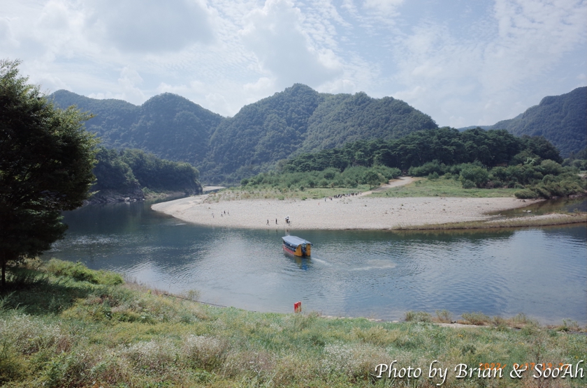 식사를 마치고 나서는 바로 옆의 장릉이 아닌 버스를 타고 조금 더 이동해서는 첫 방문지인 청령포로 이동했습니다. 아래 사진에서 보듯이 동강이 굽이쳐 돌아가는 그 너머의 청령포는 배를 타고 들어가지 않으면 뒤쪽으로 나 있는 숲과 산으로는 나갈 수 없으니, 서해나 남해의 고도에 위리안치 된 것과 같았을 게, 가보니가 알겠더군요. 늦더위가 기승을 부리는 초가을의 땡볕에 주차장에 차를 세우고, 나름 고개를 내려가서는 배를 타고는 청령포로 들어가는데, 청령포 쪽에 내려도 나무가 있는 그늘까지 가려면 꽤나 넓은 자갈밭을 걸어가야 하는데.. 여기 정말 갇혀 살았다면, 이 아름다운 경치가 과연 아름답게 느껴졌을까 싶어서 왠지 모르게 가슴이 메어오더군요.
