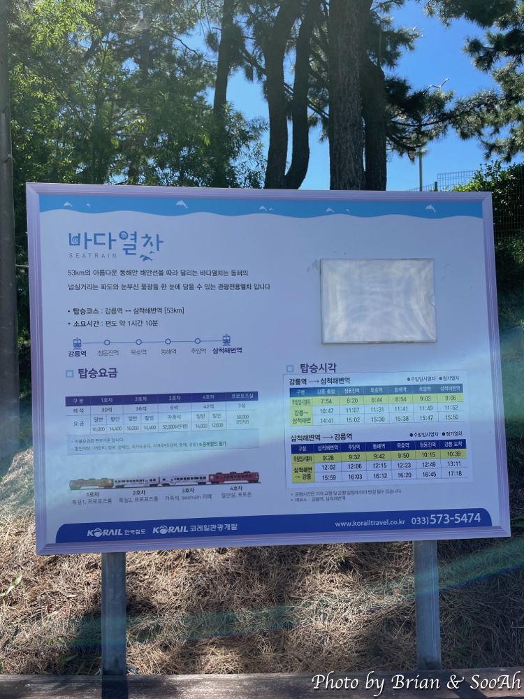 해외 여행, 특히 유럽 여행을 가면 기차를 타고 이동을 하거나 또는 특별한 관광열차를 타고 다니면서 기차여행을 즐기게 되는데요, 저같은 경우 국내에서는 주로 자차로 이동하다 보니 기차는 출장 때나 출장비 처리가 편해서 이용할 때 빼고는 잘 안 타는 편이었습니다. 그러나 최근에 코로나 때문이기도 하고, 또 운전을 하면 술을 못 마시는 아쉬움이 있어서... 그래서 이래저래 열차로 이동하는 여행계획을 짜다 보니, 코레일에서 여러가지 관광열차를 운영하는 것을 알게 되서는 그 첫번째 시도로 "동해바다열차"를 예매했습니다. 다른 "관광열차"처럼 코레일 홈페이지에서 예매하는 것이 아니라 별도의 홈페이지에서 예매를 해야 하는데, 운행 시간은 오전 1회 오후 1회 강릉역에서 삼척해변역을 왕복 운행하는데, 주말에는 오전에 1회가 더 추가됩니다. 강릉에서 삼척해변까지 편도르는 약 1시간 10분정도 걸리는데요, 서울에서 가는 경우에는 KTX를 타고 가면 강릉에서 출발하는 걸 탈 수 있지만, 제가 사는 수원에서는 대중교통으로는 가장 이른 버스를 타거나 기차를 타고 서울 찍고 가더래도 오전에 강릉에서 출발하는 기차를 탈 수가 없어서, 시외버스를 타고 삼척해변역으로 가서 삼척해변역에서 강릉역으로 가는 편도를 타고는 강릉에서 수원으로 돌아오는 당일치기 일정을 계획하고 실행에 옮겼습니다.
