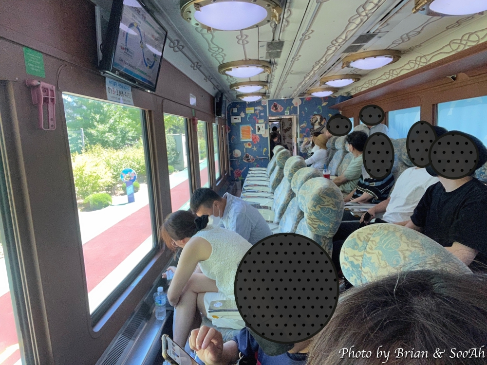 총 4칸의 차량으로 구성되어 있는데, 차량별로 외관 Wrapping도 다르고, 또 좌석 배치도 다르더군요. 1,2호차는 차량 진행 방향이 아닌 바다쪽인 동쪽 방향으로 단차가 있는 2열로 된 좌석이 주욱 놓여 있고(아래 오른쪽 사진), 3호차는 가족석 및 매점과 안내방송을 하는 부스가 있는 구성이었습니다. 4호차도 1,2호차랑 같은 구성으로 기억하는데, 어찌 되었든 1호차의 창가 바로 앞열 좌석을 예매해서는, 도착한 열차에서 강릉에서 온 승객들이 다 내리고 나간 이후에 강릉으로 가는 저랑 같은 방향의 승객들이 탑승하고는 얼마지 않아서 열차는 출발했습니다.
