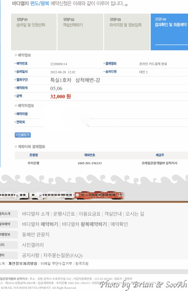 해외 여행, 특히 유럽 여행을 가면 기차를 타고 이동을 하거나 또는 특별한 관광열차를 타고 다니면서 기차여행을 즐기게 되는데요, 저같은 경우 국내에서는 주로 자차로 이동하다 보니 기차는 출장 때나 출장비 처리가 편해서 이용할 때 빼고는 잘 안 타는 편이었습니다. 그러나 최근에 코로나 때문이기도 하고, 또 운전을 하면 술을 못 마시는 아쉬움이 있어서... 그래서 이래저래 열차로 이동하는 여행계획을 짜다 보니, 코레일에서 여러가지 관광열차를 운영하는 것을 알게 되서는 그 첫번째 시도로 "동해바다열차"를 예매했습니다. 다른 "관광열차"처럼 코레일 홈페이지에서 예매하는 것이 아니라 별도의 홈페이지에서 예매를 해야 하는데, 운행 시간은 오전 1회 오후 1회 강릉역에서 삼척해변역을 왕복 운행하는데, 주말에는 오전에 1회가 더 추가됩니다. 강릉에서 삼척해변까지 편도르는 약 1시간 10분정도 걸리는데요, 서울에서 가는 경우에는 KTX를 타고 가면 강릉에서 출발하는 걸 탈 수 있지만, 제가 사는 수원에서는 대중교통으로는 가장 이른 버스를 타거나 기차를 타고 서울 찍고 가더래도 오전에 강릉에서 출발하는 기차를 탈 수가 없어서, 시외버스를 타고 삼척해변역으로 가서 삼척해변역에서 강릉역으로 가는 편도를 타고는 강릉에서 수원으로 돌아오는 당일치기 일정을 계획하고 실행에 옮겼습니다.