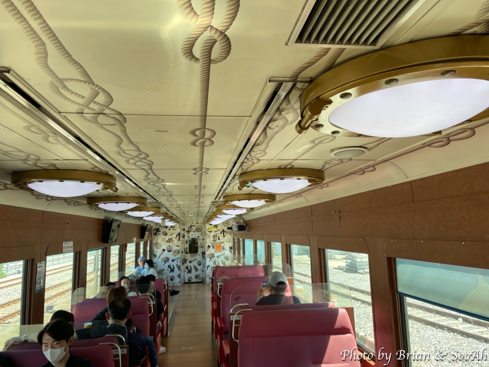 열차가 지하로 들어서서는 더 이상 밖을 내다볼 일이 없어져서는 자리를 일어나 1호차를 떠나 다른 호차로 가봤습니다. 2호차는 1호차랑 마찬가지로 바다를 바라보도록 된 2줄의 좌석으로 구성이 되어 있었고, 3호차에는 방송을 하는 부스와 가족석이 있더군요. 4호차는 1,2호차랑 비슷한 구조인데, 좌석이 더 많이 들어가서 촘촘하게 되어 있더군요.