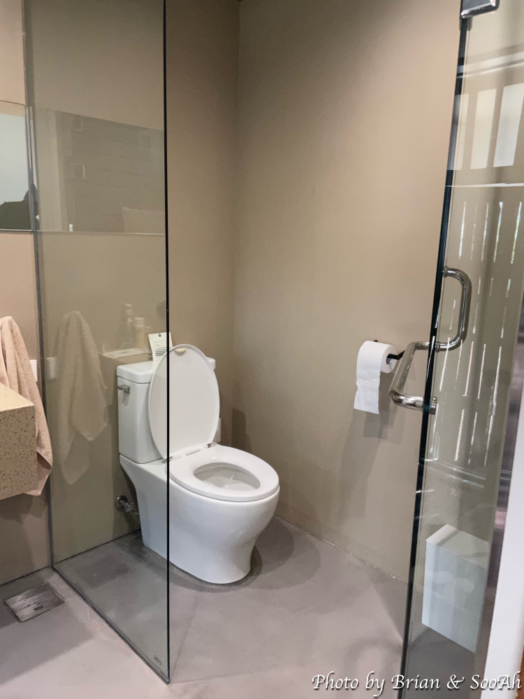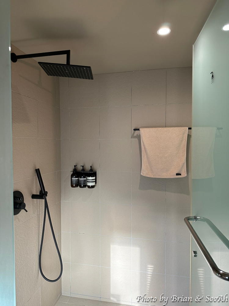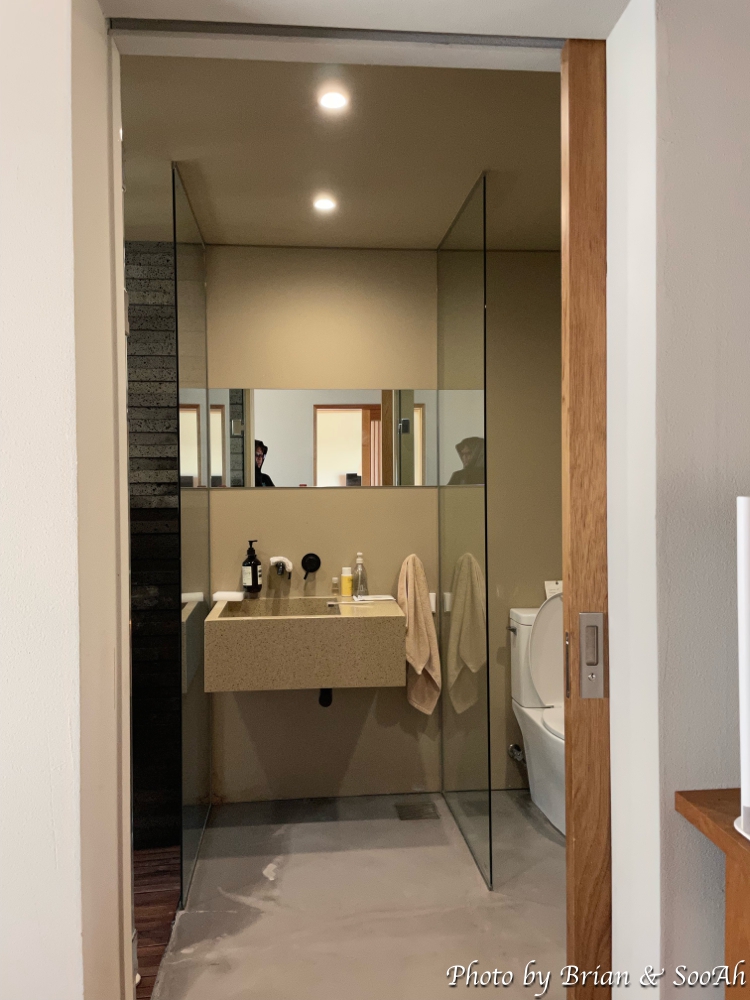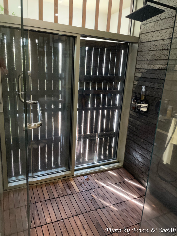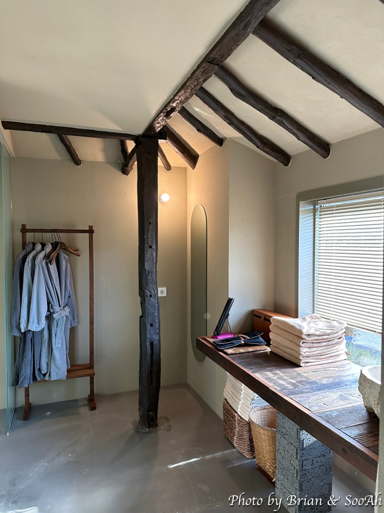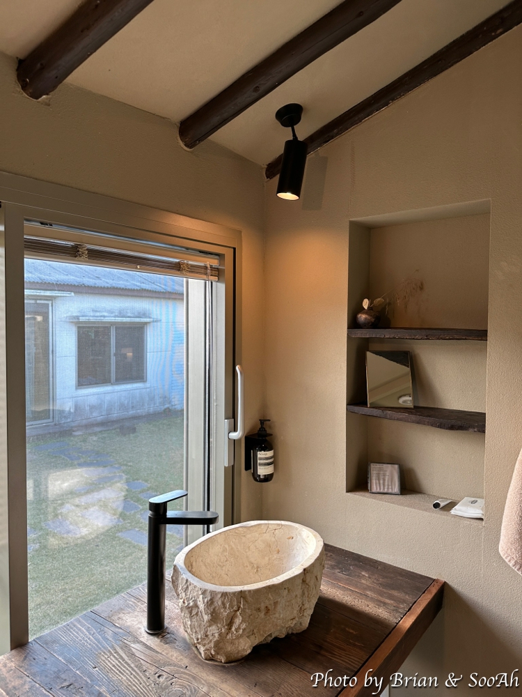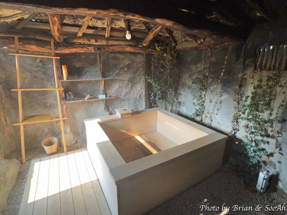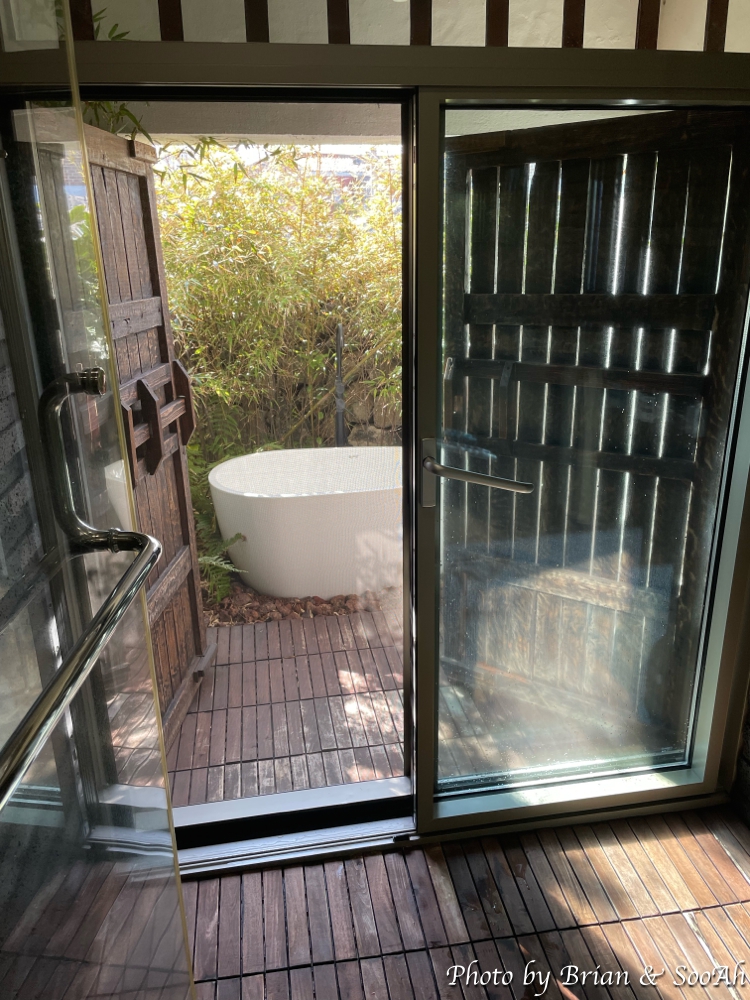 침실과 수납공간을 지나면 바로 세면대와 그 양 옆으로 샤워실과 화장실이 있습니다. 샤워실 너머로는 옛 한옥의 나무대문이 있는데 이걸 열면 다시 조그만 공간이 나오고 여기에는 야외욕조가 있어서 원한다면 야외에서 여유를 즐길 수 있더군요.