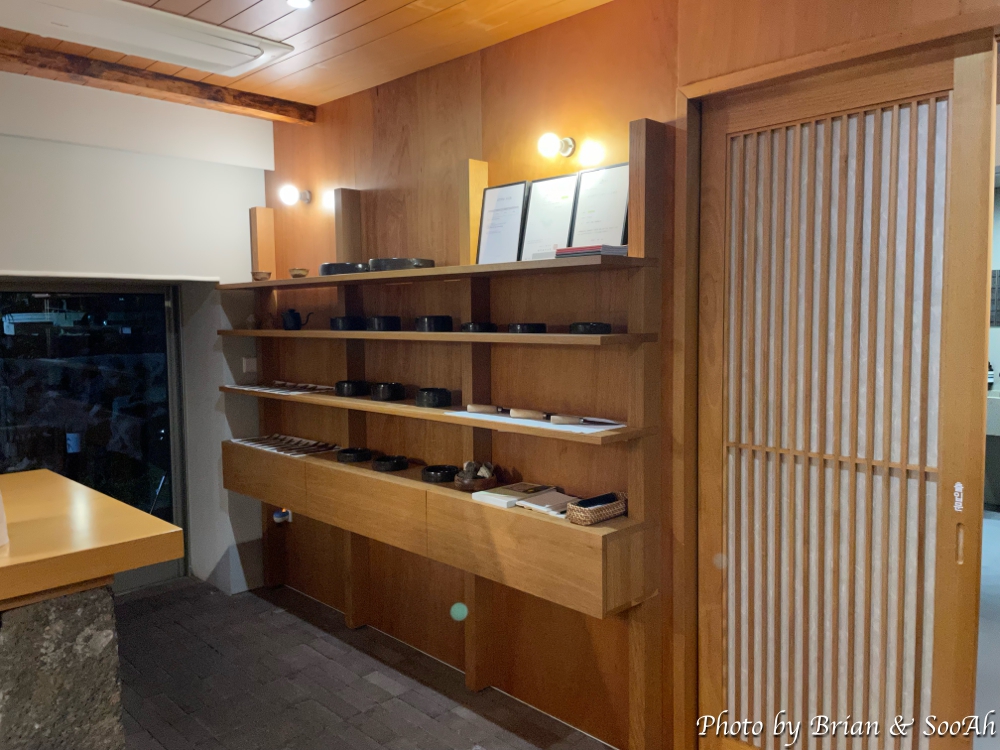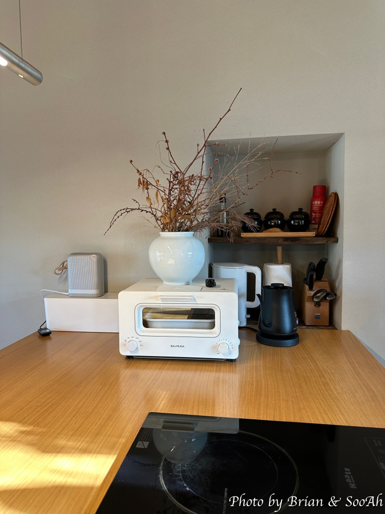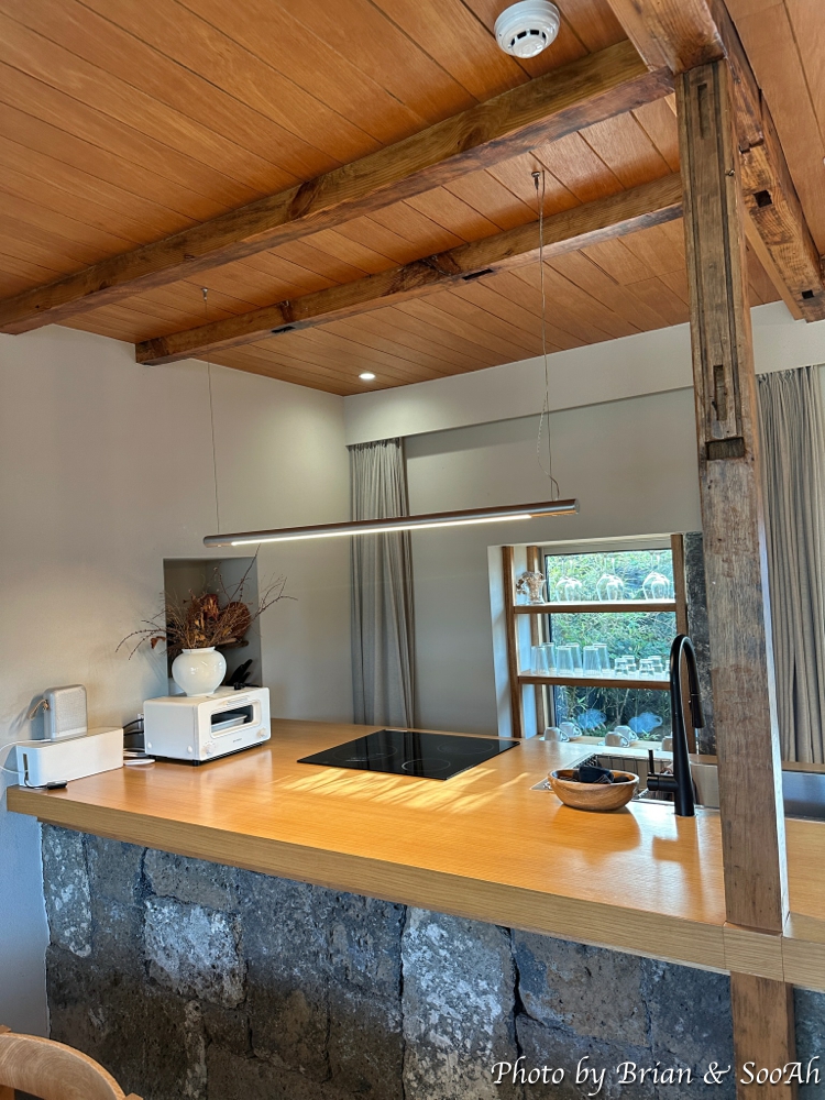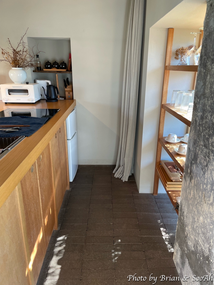 일단 저희 부부는 부엌과 테이블이 있는 바깥채에 머물렀는데요. 유리 미닫이문으로 된 문을 열고 들어가면, 바로 모여서 식사를 할 수 있는 커다란 테이블과 그 너머로 길다랗게 놓여진 싱크대 너머로는 반대편 숨겨진 안뜰에는 야외에서 바베큐를 즐길 수 있는 공간이 있더군요. 그리고 커다란 벽걸이 TV와 침실과의 벽에는 마치 예술품을 진열한 듯한 식기들을 전시한 선반들이 있었습니다.