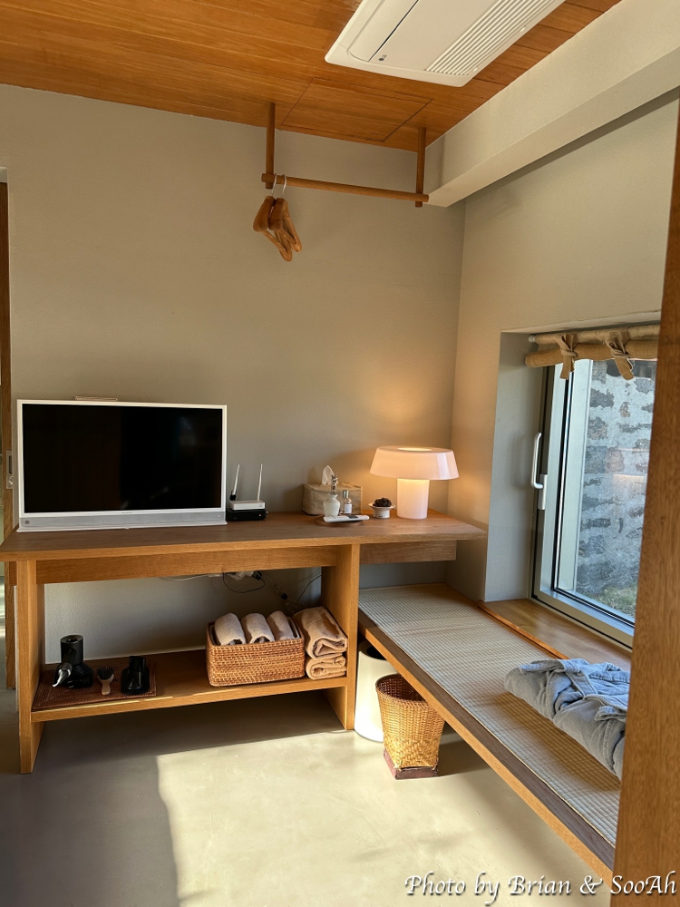 선반 옆으로 있는 미닫이문을 열고 들어가면 침실과 화장실/세면실/샤워실이 나옵니다. 일단 침실이 침대 하나가 길게 있고 통로 비슷한 공간 너머로는 화장대와 옷걸이, TV가 놓인 공간과 창가에 앉아서 바깥(안채와 마당)을 볼 수 있는 공간이 있더군요.