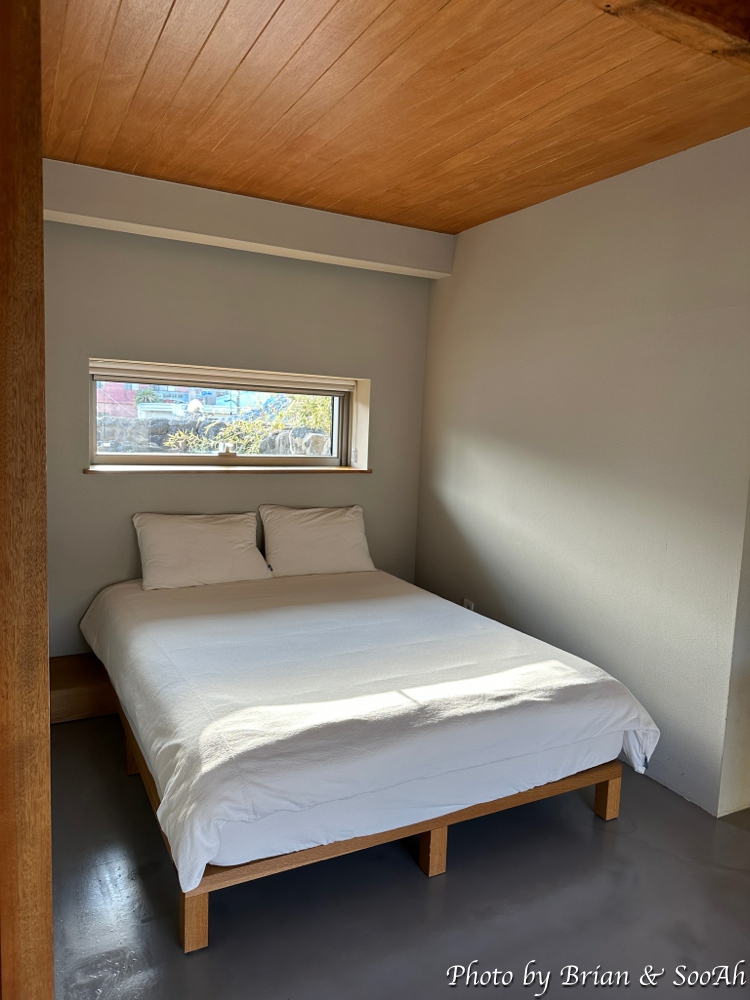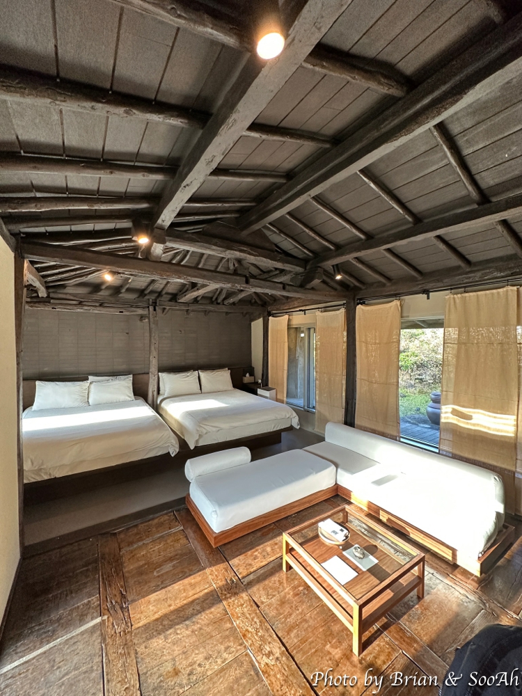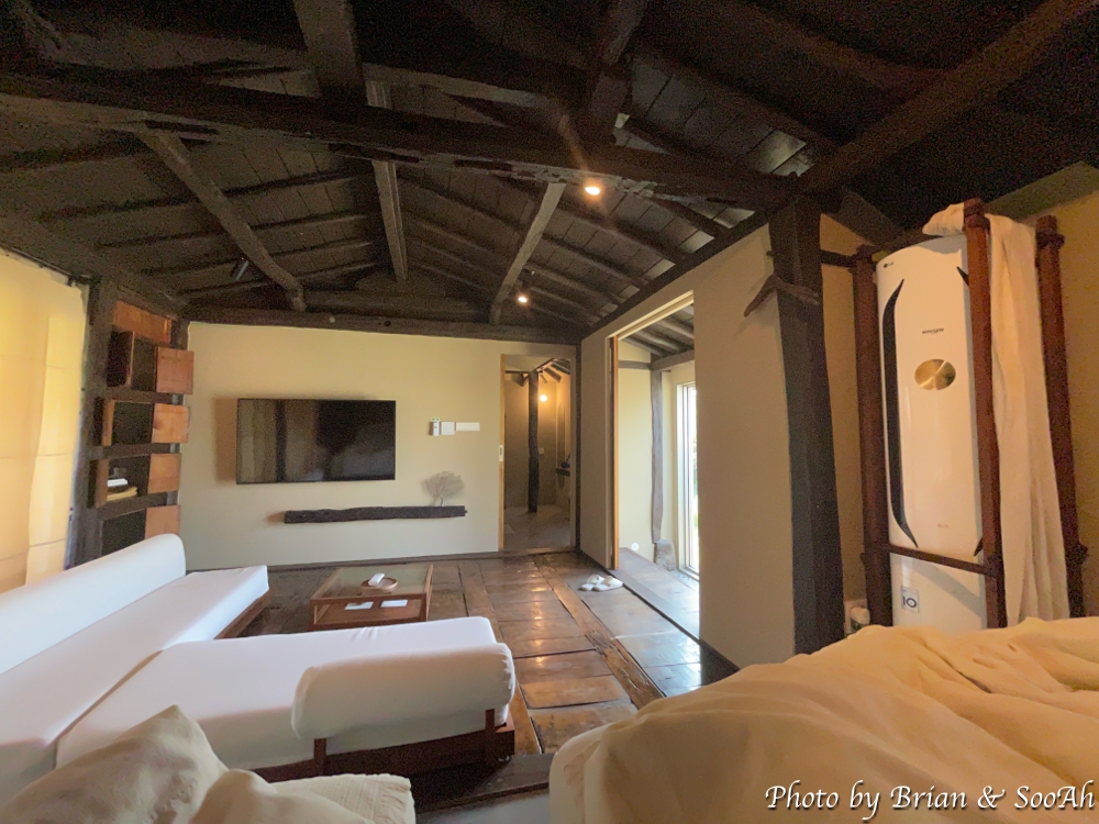 여기까지가 저희가 머물고 여행 기간 내에 야식이나 야간 담소를 나눌 때 사용했던 바깥채였구요. 건너편의 안채는 침대 3개가 놓인 침실과 낮은 소파와 테이블이 있는 거실이 오픈형으로 있는 구조더군요.