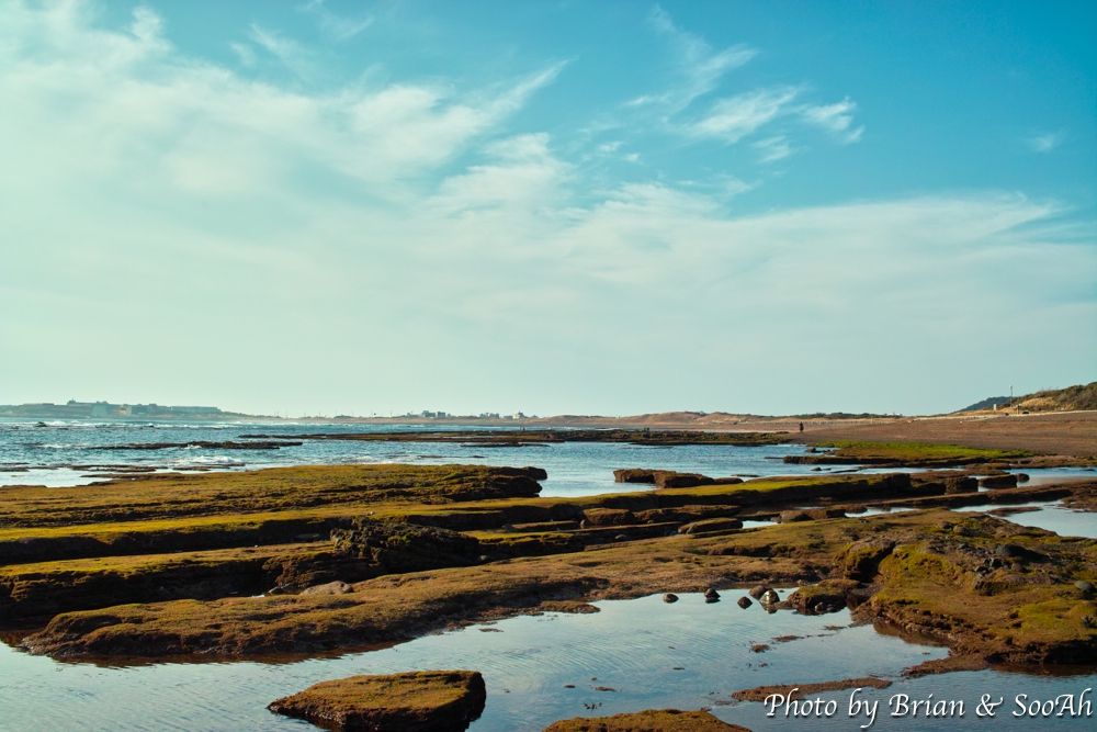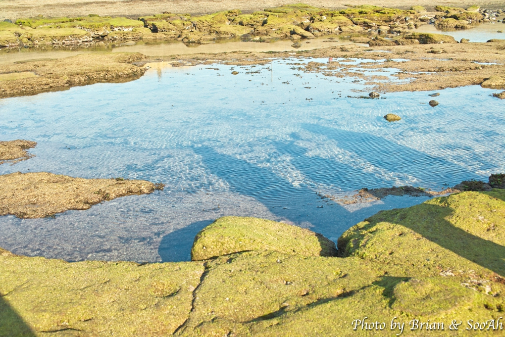 아침 일찍 숙소를 나서서 오고자 했던 곳은 썰물 때의 광치기 해변을 보기 위해서였습니다. 밀물 때에는 바닷물이 밀려와서 그냥 여느 바닷가지만, 밀물 때는 바닷물에 가려 있던 해저(?)가 드러나서는 다른 우주에 온 듯한 느낌을 주는 사진을 찍을 수 있습니다. 거기에 성산일출봉을 배경으로 사진을 찍을 수도 있구요.