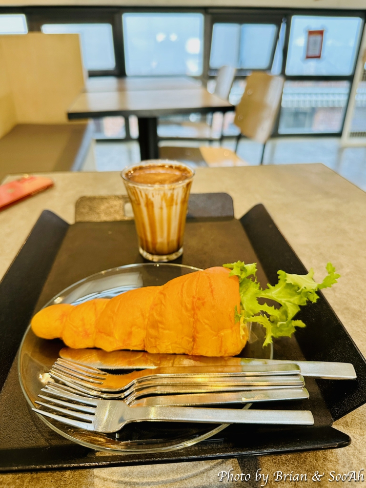 아침 햇살을 맞으면서 광치기해변에서 여러가지 인생 샷을 남기고는 오전 카페인 충전을 위해 근처에 있는 '도렐'을 들러서 커피와 당근모양 빵을 하나 먹고는 다음으로 이동했습니다..