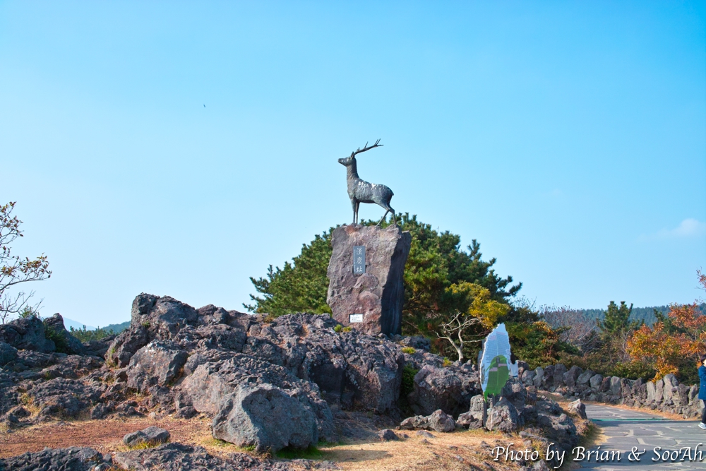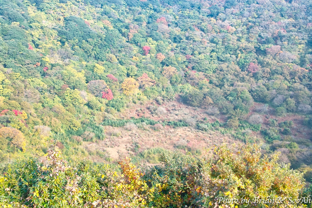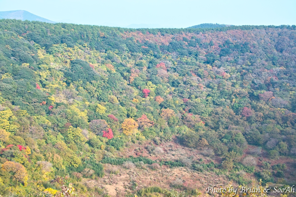 아래쪽으로 잠깐.... 내려갔다가 다시 사슴상과 초소가 있는 분지 돌담길의 가장 고도가 높은 곳에 도착하니, 올라온 길을 기준으로 오른쪽(서쪽)에 해당하는 곳이 모두 억새밭이고, 반대로 남쪽으로는 단풍이 절정인 분화구...인지 움푹 파인 계곡인지가 보이던데 장관이더군요.