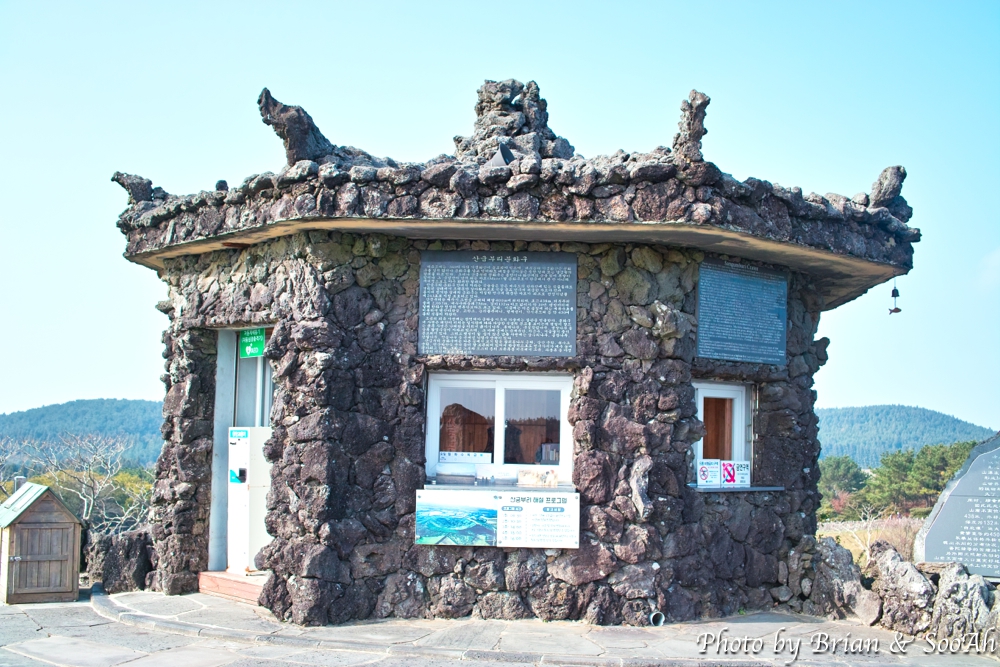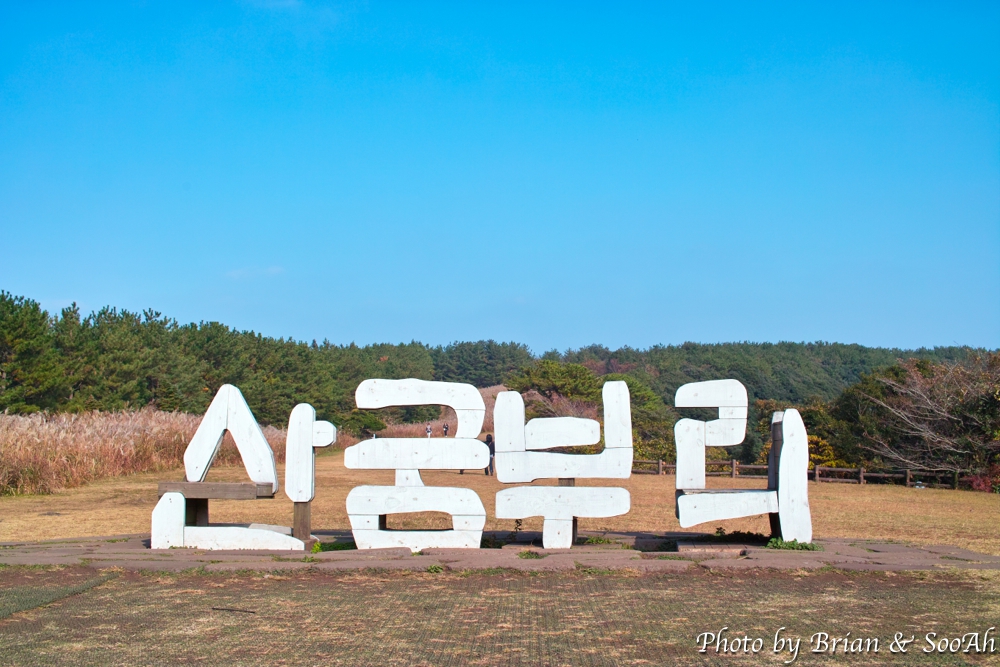 위 사진의 오르막을 따라 올라가면 분지가 나옵니다. 분지 안으로 들어갈수도 있지만 분지를 따라 있는 돌담길을 걷는 산책로로도 많이 걷습니다. 이 분지의 둘레길을 걷다 보면 갈래길로 아래쪽으로 내려 가면 "산굼부리"라는 글자의 조형물이 있어서 많이들 사진을 찍더군요. 그래서 우리 일행도 여기서 사진을 찍었습니다.