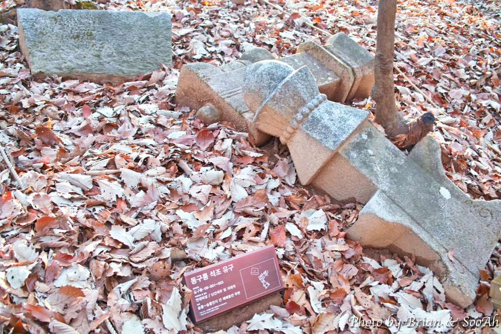 원릉에서 표석에 대한 걸 설명을 듣고 나서는 다시 지도 상으로 왼쪽으로 계속 이동해서는 가장 안쪽에 위치한 숭릉(崇陵)으로 향했습니다. 가는 길에 보니 정방형의 인공호수에 원형 섬을만들어 둔 게 보이더군요. 그리고 거기서 더 올라가면 원래는 고종의 비인 효자왕비(aka 명성황후 민씨)의 묘를 만들려고 터를 잡고 또 석조물을 만들어 두려 했습니다만, 결국엔 이리 오지 못하고, 그래서 그 때 만들다 버려진 석조물들이 남아 있어서 가는 길에 잠깐 볼 수 있었습니다.