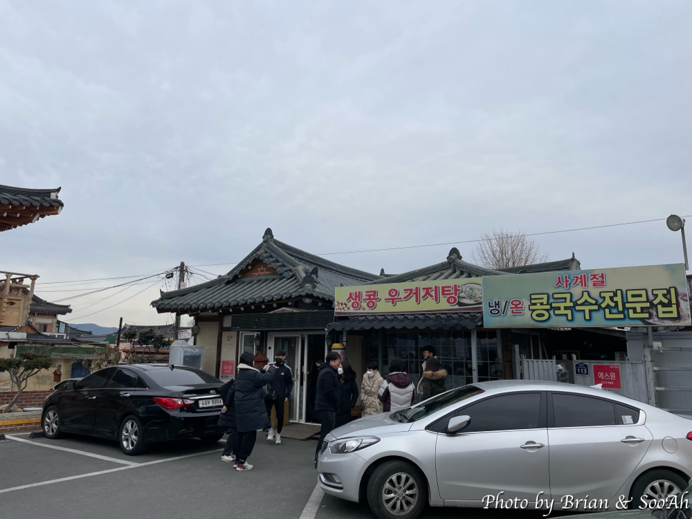문무대왕릉과 감은사지를 보고 나서 다시 경주 시내로 돌아오니, 한 두 개씩 오픈하는 가게가 있어서, 사전에 오픈 시간을 알아둔 첨성대 바로 옆의 경주원조콩국이란 곳을 가 봤습니다. 9시 오픈이라고 했는데, 8시 45분쯤 도착했는데 이미 문을 열어서 영업 중이라 기다리지 않고 바로 들어가서 드디어 아침을 먹을 수 있었습니다. 최근에 '놀면뭐하니'에서 대구쪽의 추억의 분식? 같은 걸로 나온 적 있는 도너츠가 들어간 콩국이 나왔는데, 이 집이 바로 그 도너츠가 들어간 콩국을 하는 집입니다. 대구가 먼저인지 경주가 먼저인지 잘 모르겠고, 마나느님의 얘기에 따르면 원래 대만 쪽의 음식이라고도 하던데... 어쨌든 콩국을 즐겨하지 않는 저에게는 좀 상상이 안 가는 맛이지만, 어쨌든 파전과 도너츠콩국 그리고 을 시켜서 아침을 든든히 먹었습니다. 아침 일찍 여는 집이 많지도 않고, 부담스럽지도 않은 양과 가격에 현지 분들은 물론 관광객들도 많이 찾더군요. 조금만 늦었으면 대기하고 먹을 뻔 했습니다.