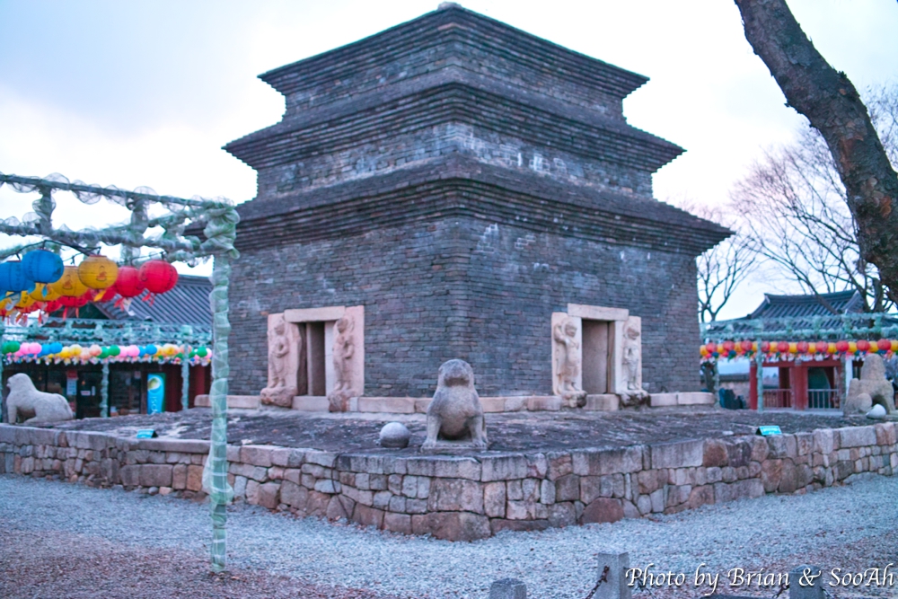 다른 터만 남거나 탑만 남은 곳과 달리 분황사는 아직도 현존하는 사찰인데, 여긴 아무래도 (이젠 사라진 번호이지만) 국보 30호였던 모전석탑이 보고 싶어 들렀습니다. 모전석탑이란 벽돌 모양으로 만든 돌로 쌓은 탑을 이야기 합니다. 보통 아는 석탑처럼 큰 돌을 깎고 부순 것도 아니고, 흙으로 벽돌을 만들 정도의 풍족한 흙이 되는 것도 아니어서 벽돌탑(전탑)을 모방한 것이라고 보면 되는데요. 원래는 9층이었을 것으로 추정되는데, 현재는 저렇게 낮게만 남아 있긴 해도 그만큼만 해도 엄청난 위용을 자랑하더군요.