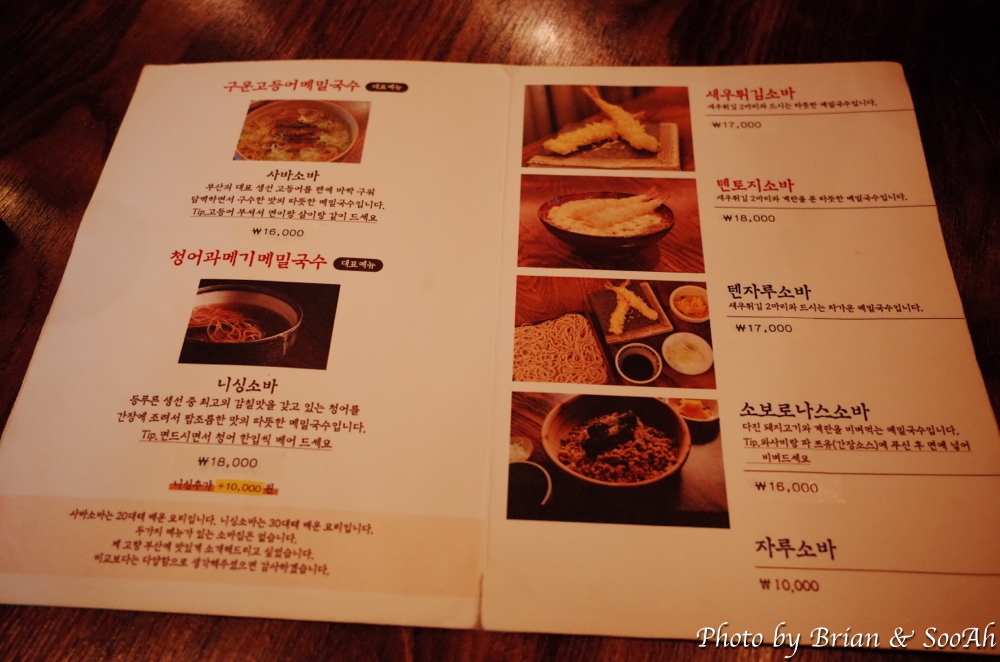 오픈 시간 전에 도착해서 근처를 잠깐 배회하다가 11시 오픈 시간에 맞춰서 입장을 했는데요, 제가 워낙 면식을 좋아하는데다가, 생선도 좋아하다 보니, 이 가게에서 파는 니싱소바(청어소바)나 사바소바(고등어소바)가 너무 궁금해서, 해운대에 도착해서 먹는 첫 식사로 찾아갔드랬습니다. 그리 넓지 않은 가게이지만 전형적인 일본식 소바집 인테리어였습니다. 메뉴판을 보고는 마나느님과 각각 하나씩 니싱소바와 사바소바를 시키고 또 계란말이를 하나 시켰습니다.