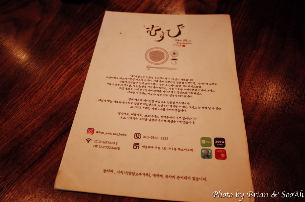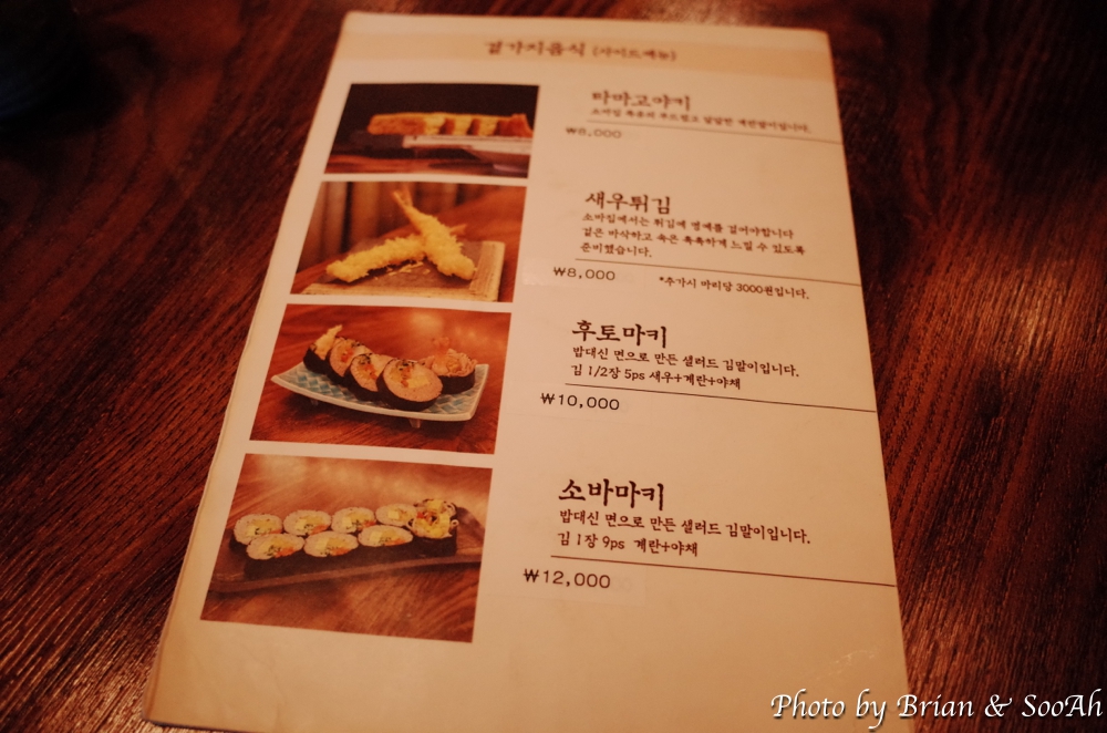 오픈 시간 전에 도착해서 근처를 잠깐 배회하다가 11시 오픈 시간에 맞춰서 입장을 했는데요, 제가 워낙 면식을 좋아하는데다가, 생선도 좋아하다 보니, 이 가게에서 파는 니싱소바(청어소바)나 사바소바(고등어소바)가 너무 궁금해서, 해운대에 도착해서 먹는 첫 식사로 찾아갔드랬습니다. 그리 넓지 않은 가게이지만 전형적인 일본식 소바집 인테리어였습니다. 메뉴판을 보고는 마나느님과 각각 하나씩 니싱소바와 사바소바를 시키고 또 계란말이를 하나 시켰습니다.