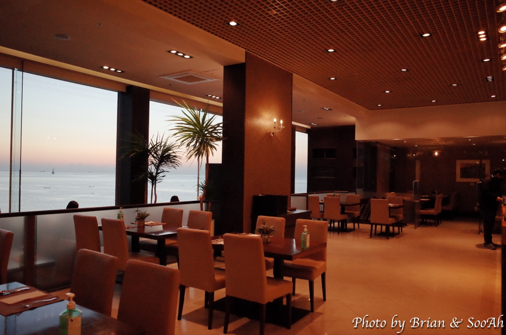 이 여행에서 묶었던 숙소가 해운대 해수욕장에서 다른 건물에 막힘 없이 바다를 바라보는 전경으로 유명한 곳이있던지라, 둘째날 아침에는 어케든 호텔 조식을 먹고, 또 일찍 가서는 창가에 앉아서 일출을 보려고 했습니다. 그래서, 아침에 일어나자마자 눈꼽만 떼고, 모자를 푹 뒤집어 쓰고는 조식 시작하는 시간에 갔는데, 다행히 기다리는 이가 많지 않아 창가에 앉을 수 있었습니다.