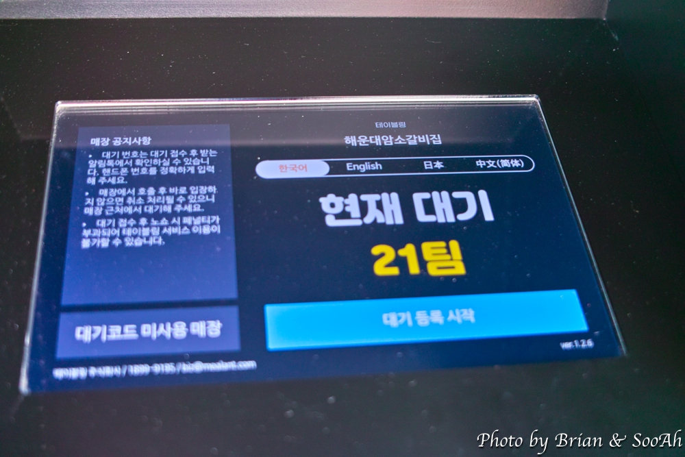 동백섬 아침산책을 마치고 숙소로 돌아와서 씻은 다음에 이른 점심을 먹으러, 나름 해운대에서 가장 유명한 가게 중 하나인 해운대암소갈비로 향했습니다. '테이블링'앱을 통해서 예약을 한다는 얘기도 있었는데, 이 즈음에는 앱으로는 예약이 아니라, 가게 앞에 설치된 번호표 뽑는 기계(테이블링 앱에 현재 대기자수가 연동되긴 함)가 오픈 시간 1~2시간 전에 발권하기 시작하는데, 거기서 번호표를 뽑아야 하더군요. 저도 16번 정도로 뽑아서는 가게 안 마당에 앉아서 기다리는데, 가게 오픈 시간이 다가오니 사람들이 엄청 몰리고, 거의 60번대까지 번호표가 뽑혀 나가더군요.