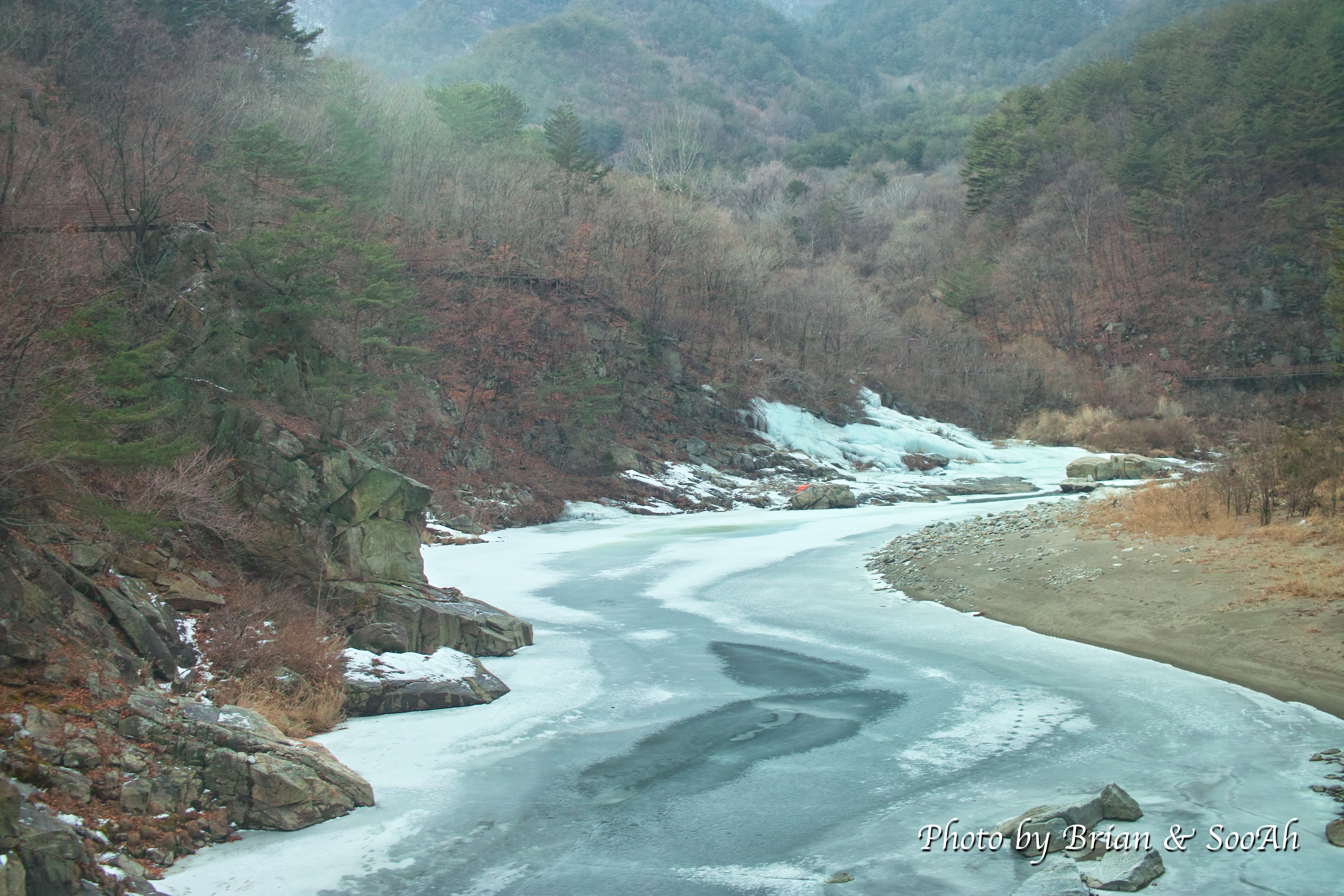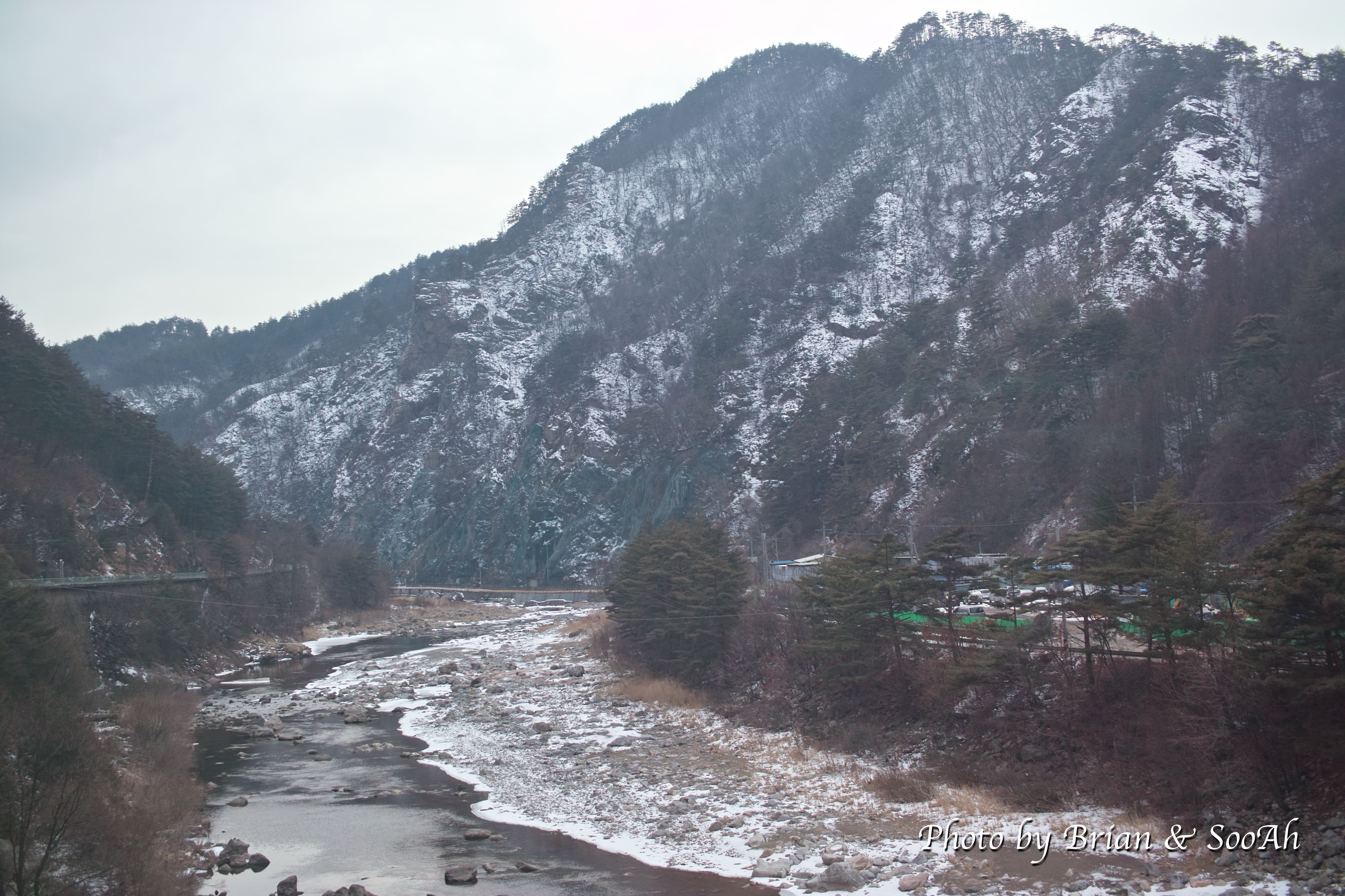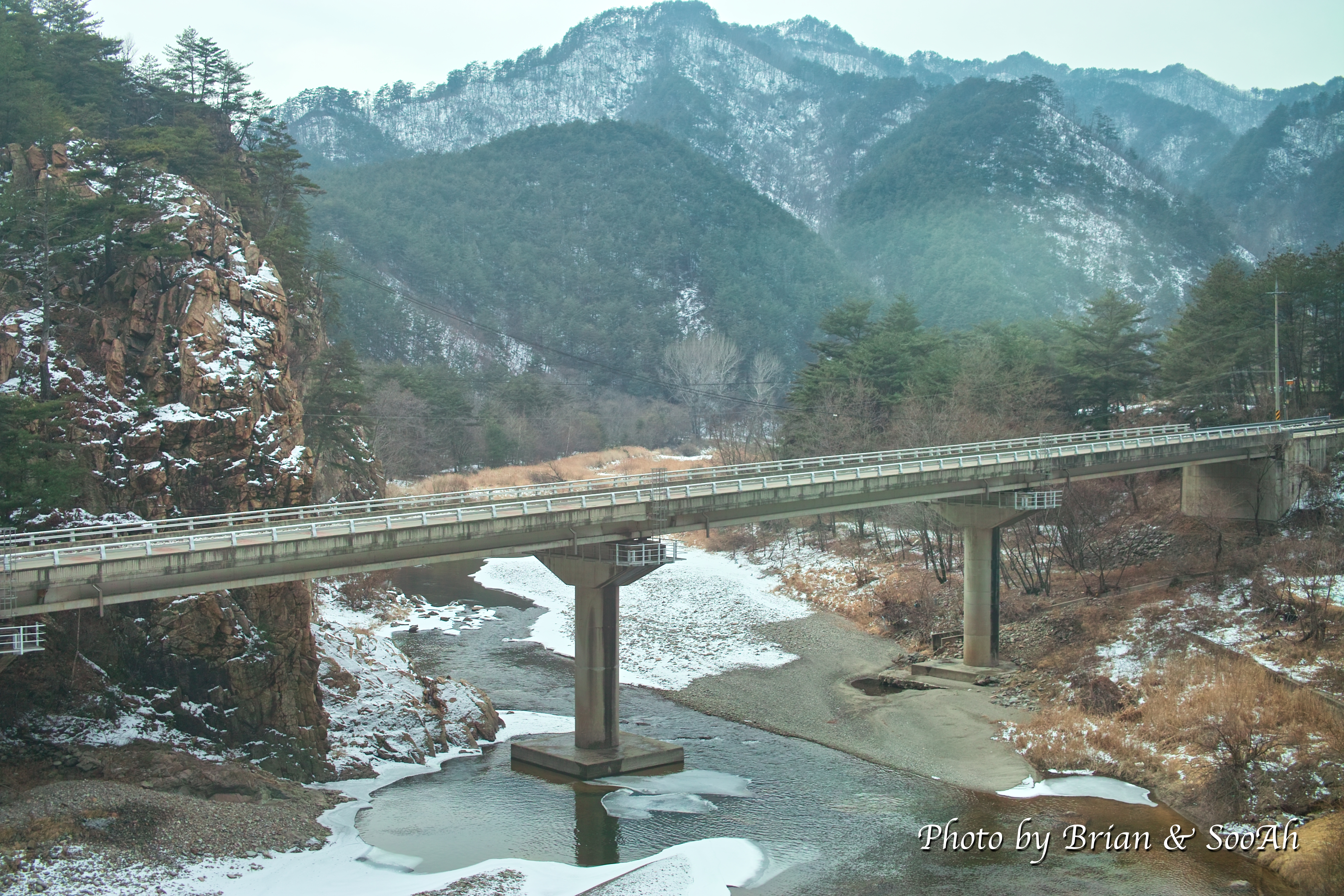 기차가 동해에서 바다구간을 끝내고는 이제 서서히 산 속으로 들어갑니다. 겨울이라 침엽수만 좀 보이고, 나머지는 눈이거나 아님 메마른 풀들이었는데요. 들어가면 갈수록 계곡이 나오고 열차가 지나는 길도 산자락 경사가 심한데 있어서 조금씩 불안도 해집니다.