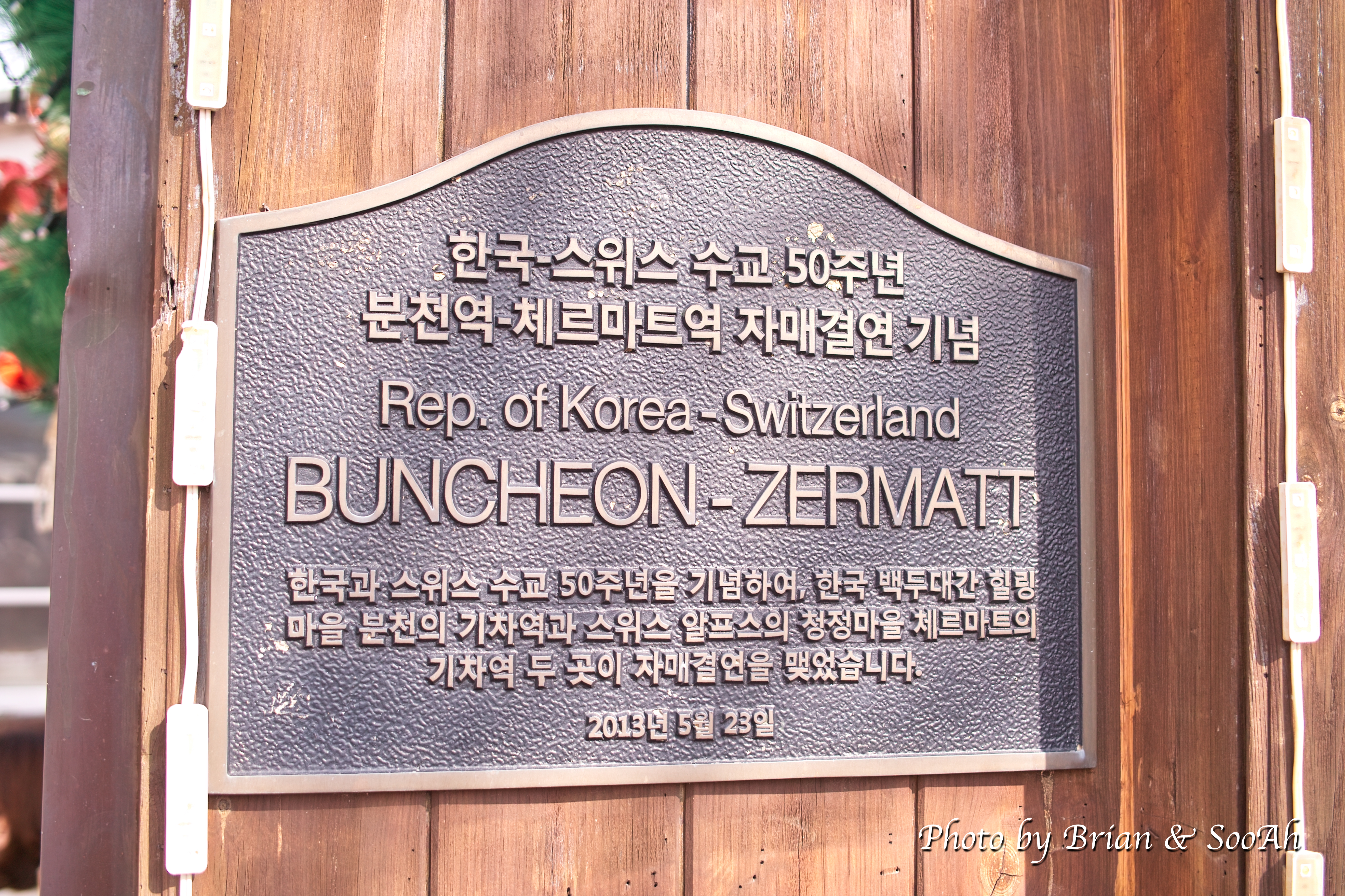 강릉에서부터 출발한 동해산타열차를 타고, 바다를 바라보며 달리다 계곡과 산 사이를 지나다 보니, 분천 산타마을에 도착하더군요. 정말 산속의 조그만 마을이더군요. 근데 그러고 보니 분천에 도착한 순간, 2016년에 스위스 여행갔을 때, 체르마트에서 자매결연한 역으로 분천역이 있었던 게 기억이 나서 혹시나 하고 봤더니, 아니나 다를까, 플랫폼에서 나오는 쪽에 보니 체르마트라고 표식이 붙어 있고, 돌아보니 그 자매결연한 걸 기념한 동판도 있더군요. 이런데서 또 지난 여행의 추억을 떠올려 봅니다.