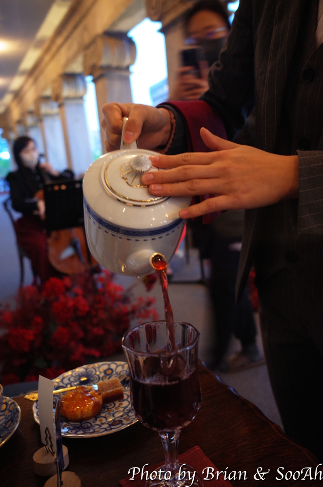 이렇게 2층까지 다 설명을 들은 다음에는 2부 행사라고 해야 하나... 암튼 2층의 발코니에 해당하는 곳으로 나가서는 음료와 다과를 즐기며 클래식 연주를 듣는 시간을 가졌습니다. 예약 당시에 자리까지 지정해서 예약을 하기 때문에, 처음 안내 받을 때 받은 목걸이에 표시된 자리 번호로 다시 한 번 자기 자리를 확인해서는 아래 사진과 같이 발코니에 있는 테이블 좌석에 번호를 찾아가서 앉습니다. 자리에는 사전에 주문해 둔 커피잔 또는 상심자차(오디차) 잔이랑 다과가 세팅된 테이블이 기다리고 있습니다. 앉을 의자에는 대한제국황실을 나타내는 오얏꽃 문양이 그려진 방석이 있었구요. 자리에 앉으니 복식을 맞춰 입은 행사 지원 인력이 와서는 음료를 따라 주고 가시더군요.