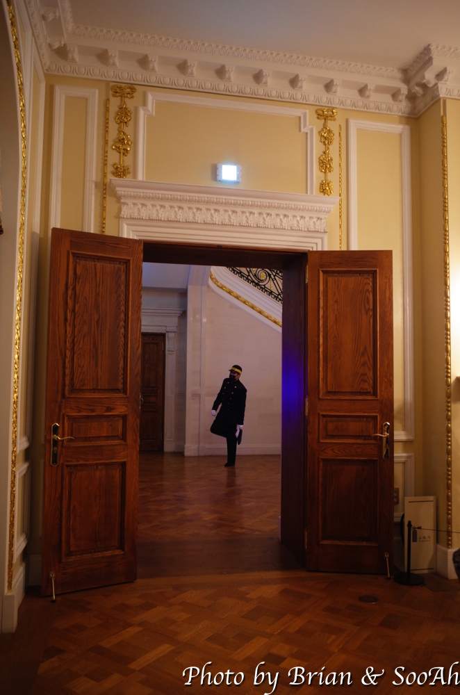 그리고는, 1층 로비 옆의 대접견실로 이동했습니다. 낮 시간의 가이드 투어에는 1층을 돌 때 이 곳을 들렀다가 2층으로 올라가고, 사진만 찍고 마는데, '밤의 석조전'에서는, 여기 대접견실의 배치를 조금 바꿔서는 창작뮤지컬 '고종-대한의 꿈'에서 나오는 노래 3곡을 2명의 배우 분께서 실제 공연하시는 걸 보는 시간을 가집니다. 의자에 앉아서는 석조전이 만들어진 직후의 고종의 기쁨과 근심을 노래하는 한 곡 '다시 품은 꿈,' 그리고 이미 세상을 떠난 명성황후를 꿈에서 만나서 위로를 받는 장면을 노래한 '안부,' 그리고 마지막으로 고종만이 아닌 당시 조선에 살던 모든 백성들의 희망찬 목소리를 들을 수 있는 '대한의 꿈'이라는 노래를 공연하는데요... 뮤지컬에서 표현된 고종에 대해서 동의하는 바는 아니나 창작물이니... 어쨌든 그런 고민을 하고 석조전과 관련되어 고종의 이야기를 풀어 나가는 이 코너도 꽤나 맘에 든 기획 중 하나였습니다. 그렇다고 개인적인 고종에 대한 생각이 바뀌진 않았지만요.