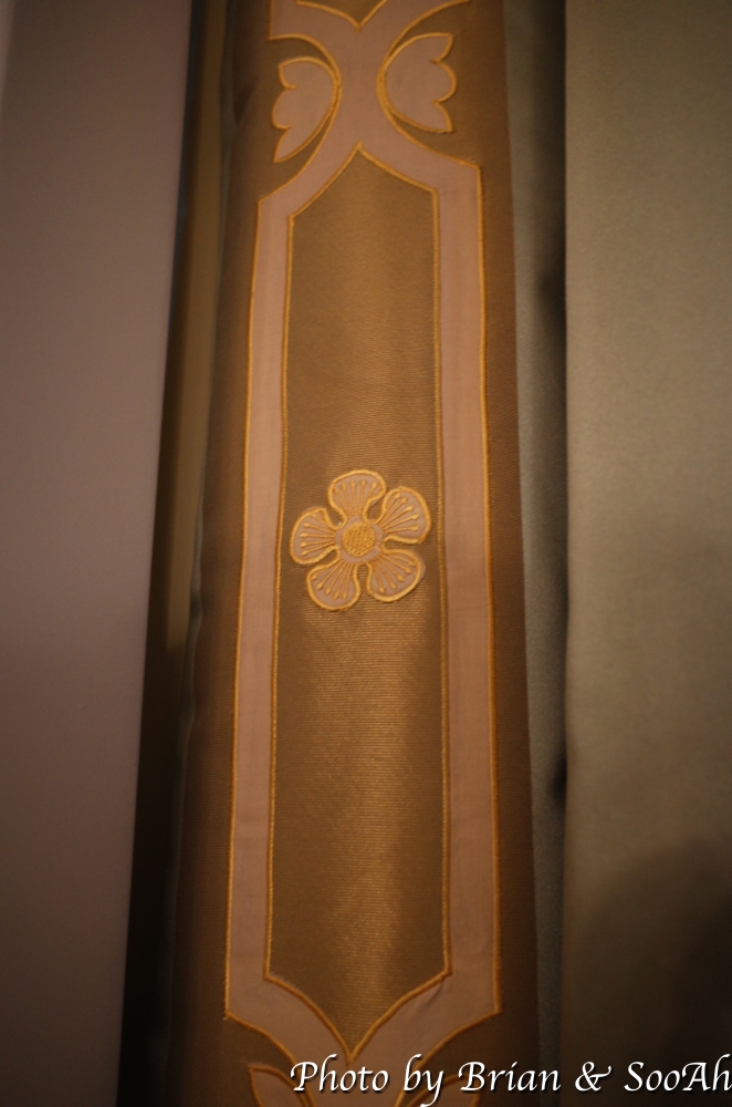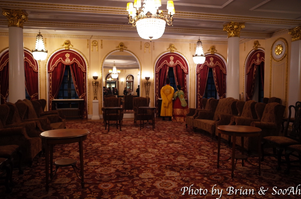 그리고는, 1층 로비 옆의 대접견실로 이동했습니다. 낮 시간의 가이드 투어에는 1층을 돌 때 이 곳을 들렀다가 2층으로 올라가고, 사진만 찍고 마는데, '밤의 석조전'에서는, 여기 대접견실의 배치를 조금 바꿔서는 창작뮤지컬 '고종-대한의 꿈'에서 나오는 노래 3곡을 2명의 배우 분께서 실제 공연하시는 걸 보는 시간을 가집니다. 의자에 앉아서는 석조전이 만들어진 직후의 고종의 기쁨과 근심을 노래하는 한 곡 '다시 품은 꿈,' 그리고 이미 세상을 떠난 명성황후를 꿈에서 만나서 위로를 받는 장면을 노래한 '안부,' 그리고 마지막으로 고종만이 아닌 당시 조선에 살던 모든 백성들의 희망찬 목소리를 들을 수 있는 '대한의 꿈'이라는 노래를 공연하는데요... 뮤지컬에서 표현된 고종에 대해서 동의하는 바는 아니나 창작물이니... 어쨌든 그런 고민을 하고 석조전과 관련되어 고종의 이야기를 풀어 나가는 이 코너도 꽤나 맘에 든 기획 중 하나였습니다. 그렇다고 개인적인 고종에 대한 생각이 바뀌진 않았지만요.