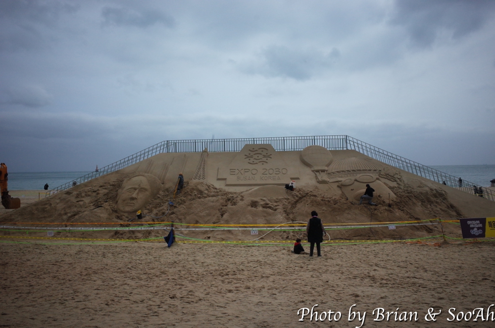 아침을 먹고는 구남로 쪽에는 일찍 연 가게들이 아직 없어서 해운대 백사장으로 이동했더니, 엑스포 유치 기원으로 모래 조형물이 설치되어 있어서 잠시 앉아 있으면서 구경을 했네요.