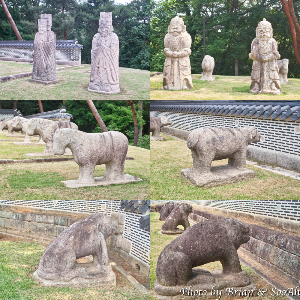쌍릉 주위에는 건원릉과 비슷한 시기에 지어졌다 보니 문인상 2쌍, 무인상 2쌍이 있고, 그 뒤부터 해서 능 뒤까지 석마, 석호, 석양들이 있는데, 자세히 보시면 이 동물석상들의 다리 사이가 비어 있는게 건원릉과 똑같네요.