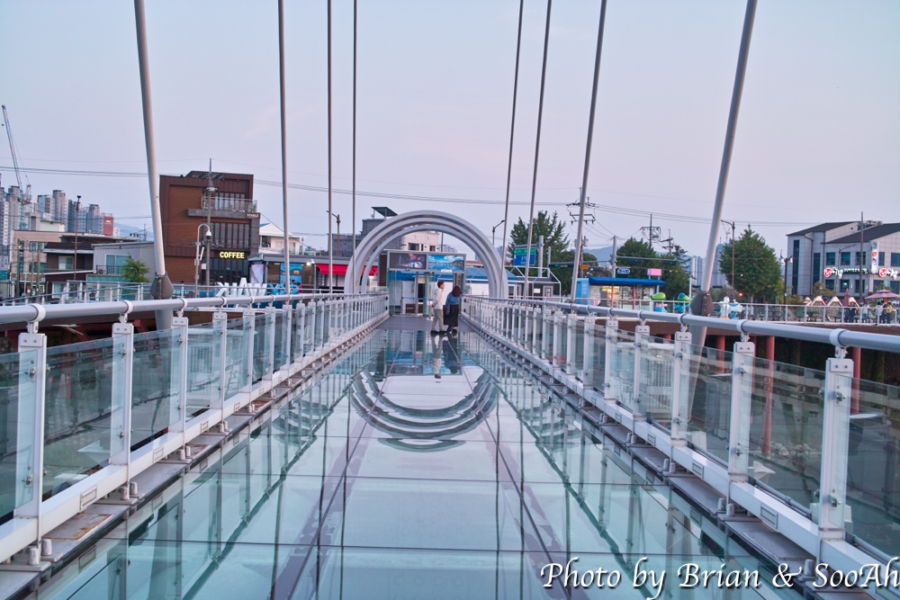 입장료를 내고 소양강스카이워크를 들어가니, 금요일 저녁이라 아직 관광객들이 많이 오지 않았는지, 저희 부부 빼고는 두 그룹 정도가 오고 가고 있어서, 아주 한산한 스카이워크를 즐길 수 있었습니다. 스카이워크를 걷는데, 여기도 아래가 투명한 소재로 되어 있어서 아래 구조물과 강물이 보이다 보니 조금 무섭기도 하더군요.